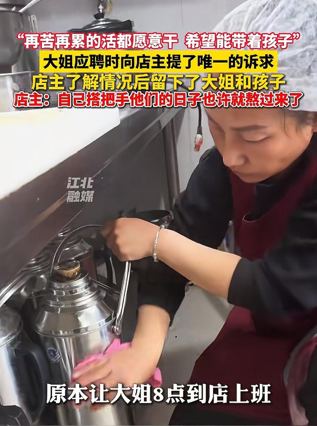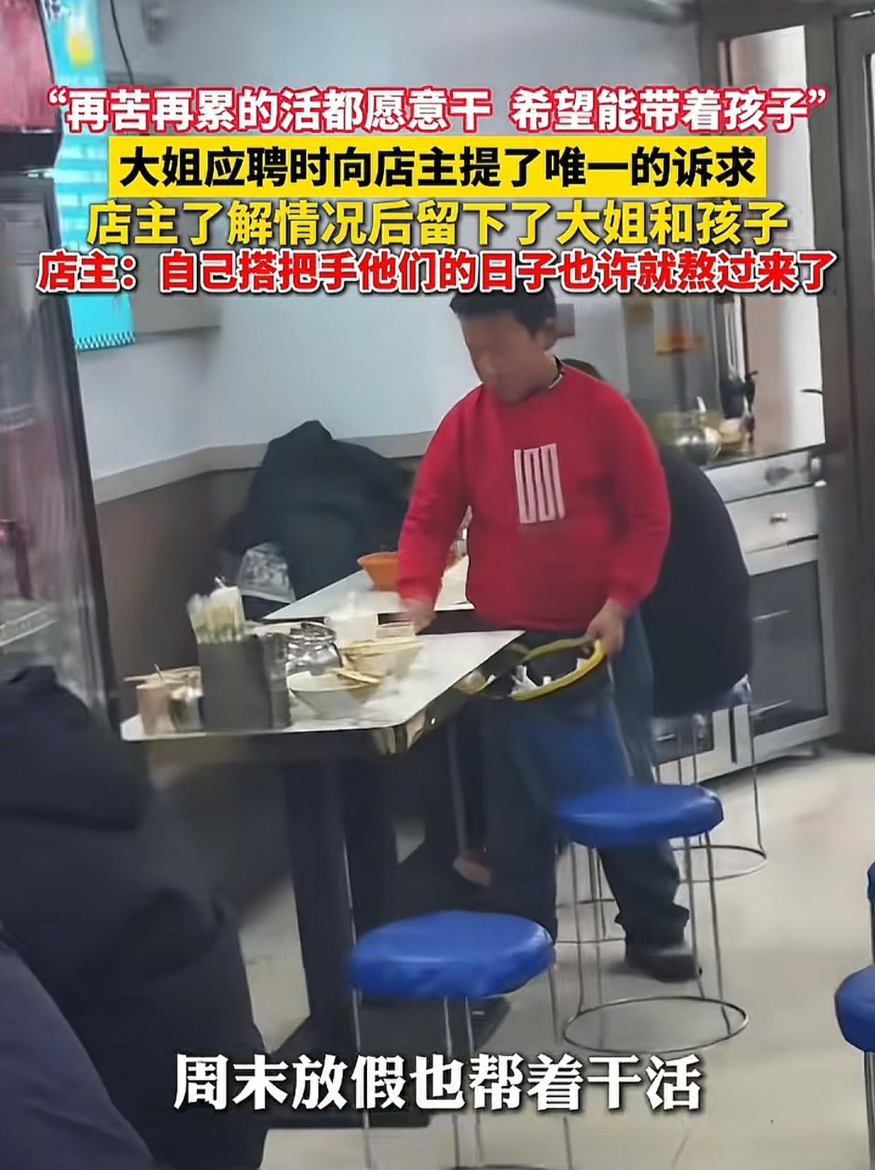 内蒙古,一位大姐去饭店应聘,小心翼翼问老板娘,上班能不能带上她不到10岁的儿子?老板娘细问缘由,听大姐诉说后眼泪差点儿掉下来。 原来,在孩子3岁的时候,大姐的老公就去世了,大姐为了给老公治病,把钱都花光了。别人还有父母公婆可以依靠,可她的父母公婆也都去世了,只剩她们娘俩儿相依为命。 过完年,大姐想去饭店打工挣钱,可去了好几个饭店,老板一听她要带孩子上班,全都拒绝了,她现在只盼着老板娘能收留她们娘俩儿,她恳求说:“妹子,你这儿的活再苦再累我都愿意干,我唯一的要求就是希望你能接纳我儿子!” 善良的老板娘一听大姐这样不容易,眼泪差点儿掉下来,赶紧表态:“你就带吧,无所谓啊,咱们开的是饭店,根本不差孩子这口吃的,姐你不用担心!” 接下来,大姐就开始上班了,让老板娘感动的是,她让大姐8点上班,可大姐每天7点半就来了,店里的活儿不管是该不该她干的,全都抢着干,完成得无可挑剔。 到了周六日,大姐的孩子也来店里,小男孩虽然年纪小但特别懂事,客人多的时候就在店外的台阶上坐着,怕给店里添乱,人少的时候孩子赶紧进店擦桌子,倒垃圾,懂事得让人心疼。 老板娘被这对母子感动,经过大姐同意后,把拍的视频发到了网上。 随后这件事情引起很多网友的关注,大家联系老板娘,要捐钱捐物帮助这对母子,可老板娘拒绝了。 老板娘专门拍了视频,说她分享这件事情的初衷是希望有更多的人尽自己力所能及之力帮助别人,并不是寻求帮助,她们不会借此热度直播,也不会接受任何捐赠。 大姐也在视频中紧紧拥抱了孩子,她表示自己要自食其力,用自己的双手挣钱,给孩子树立一个很好的榜样。 看完视频,感觉不管是老板娘还是大姐,都是值得我们尊重的人。 老板娘拉了在人生低谷中的大姐一把,给了她希望,同时对她充满尊重,掏心掏肺对她好,有善良的品性也有正确的三观。 而大姐朴实善良,懂得感恩,让我们看到了一个普通人面对人生不易时的坚韧与自尊。 说真的,很多人看哭了不是因为大姐活得有多苦,而是这件事情中老板娘和大姐带给我们的温暖和光!