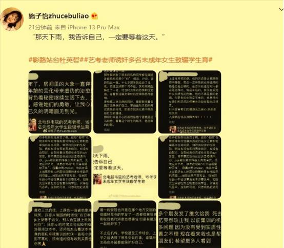 “我睡过100多个女学生。”2022年,知名艺考培训机构影路站台的校长杜英哲,曾公开炫耀,在凌辱17岁女艺考生后,在其屁股上画了一只乌龟当作胜利的标志。   17岁的女孩一遍遍擦洗着身体,能洗掉那个充满羞辱意味的“乌龟”,却怎么也洗不掉被彻底物化的羞耻感,和心里那股憋了太久、快要炸开的愤怒。   事情的曝光,其实是从另一个案子意外扯出来的。或许是老天开眼,2022年9月,北京电影学院有个学生叫赵韦弦,被人举报用“测试软件”的名义骗了上百个女生的网盘账号,私下偷看人家的私密照。   这事在网上闹得挺大,网友顺藤摸瓜一查,发现这个赵韦弦的艺考老师,是一个叫杜英哲的男人。他在北京开了个很有名的艺考机构,叫“影路站台”,专门培训想考电影学院、中戏的孩子。   结果这一查,牵扯出来的事,比赵韦弦那件更让人头皮发麻。   9月19号,一个叫施子怡的女孩站了出来。她也是北电的学生,之前也在影路站台培训过。她在社交平台发了一篇长文,里面是21个女孩的惨痛经历,时间跨度长达15年。   这些女孩去的时候大多是十七八岁,从全国各地跑到北京,家长不在身边,住着快捷酒店,一天上课十几个小时,唯一能信的就是机构的老师。   杜英哲正是利用了这一点。他上课不讲正经东西,让学生当众讲自己的第一次性经历,放那种很变态的电影,还说这是“开化”,是为了艺术献身。   他要女孩们当着他面换衣服,说是锻炼面试的胆量。有学生听话照做了,下一步就是搂抱、强吻,再下一步,就是威胁。   他威胁人不用刀,用前途。艺考有多卷大家都知道,考试就在眼前,谁敢拿自己的前途去赌?   更让人震惊的是,他老婆陈昕也在机构里。大家叫了十几年的“陈姐”不但没有制止,反而帮着老公挑人。   有女孩哭诉,是陈昕主动约她去泡温泉,到了地方才发现杜英哲也在。陈昕劝她别穿衣服,说“里面黑,看不见”。可等她进去,陈昕走了,杜英哲进来了。   其中,有怀孕的女学生,可她不敢告诉家人,不敢报警,最后只能辍学。15年,上百个女孩,就这么被一个“恶魔”拿捏着。   好在这一次,事情捂不住了。施子怡那篇长文发出来后,终于引起轰动。9月22号,北京海淀警方发了通报,杜英哲被刑事拘留;10月底,教育部、公安部、市场监管总局联合出手,对全国的艺考机构开始专项治理。   这些措施虽不能挽回已造成的伤害,但至少能防止下一个“恶魔”的出现。   如今,杜英哲正等待法律的审判,而那些被画上乌龟的女孩,可能一辈子都带着心理的伤疤。   艺术本该是照亮梦想的光,而不是吞噬青春的黑洞,这些受害者们需要的不只是惩罚施暴者,更是一个不再让“权威”变成暴力工具的环境。   对此你有什么看法?欢迎在评论区留言讨论。艺考 未成年保护性侵   信息来源: 澎湃新闻|北电女生曝艺考老师诱奸多人,警方通报 文|墨海 编辑|史叔