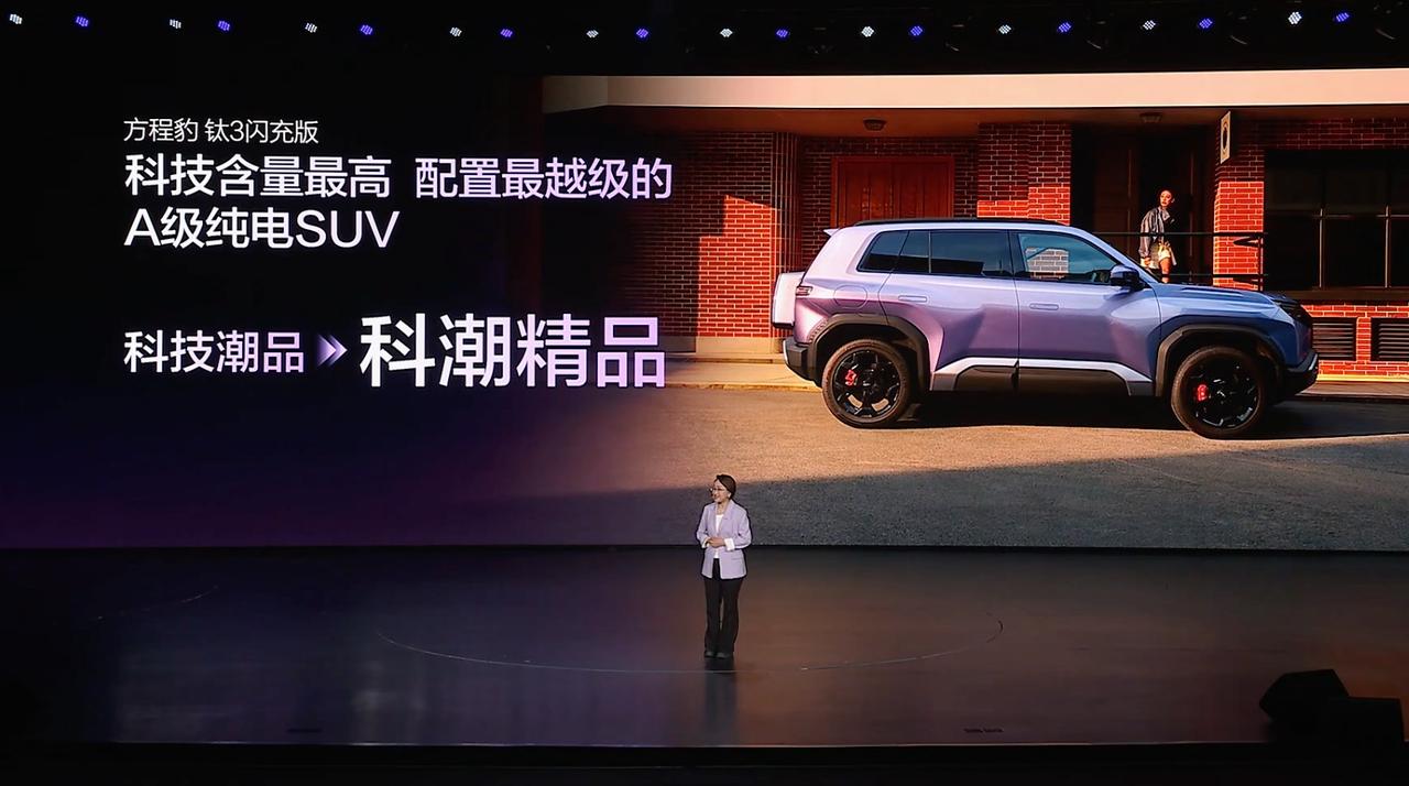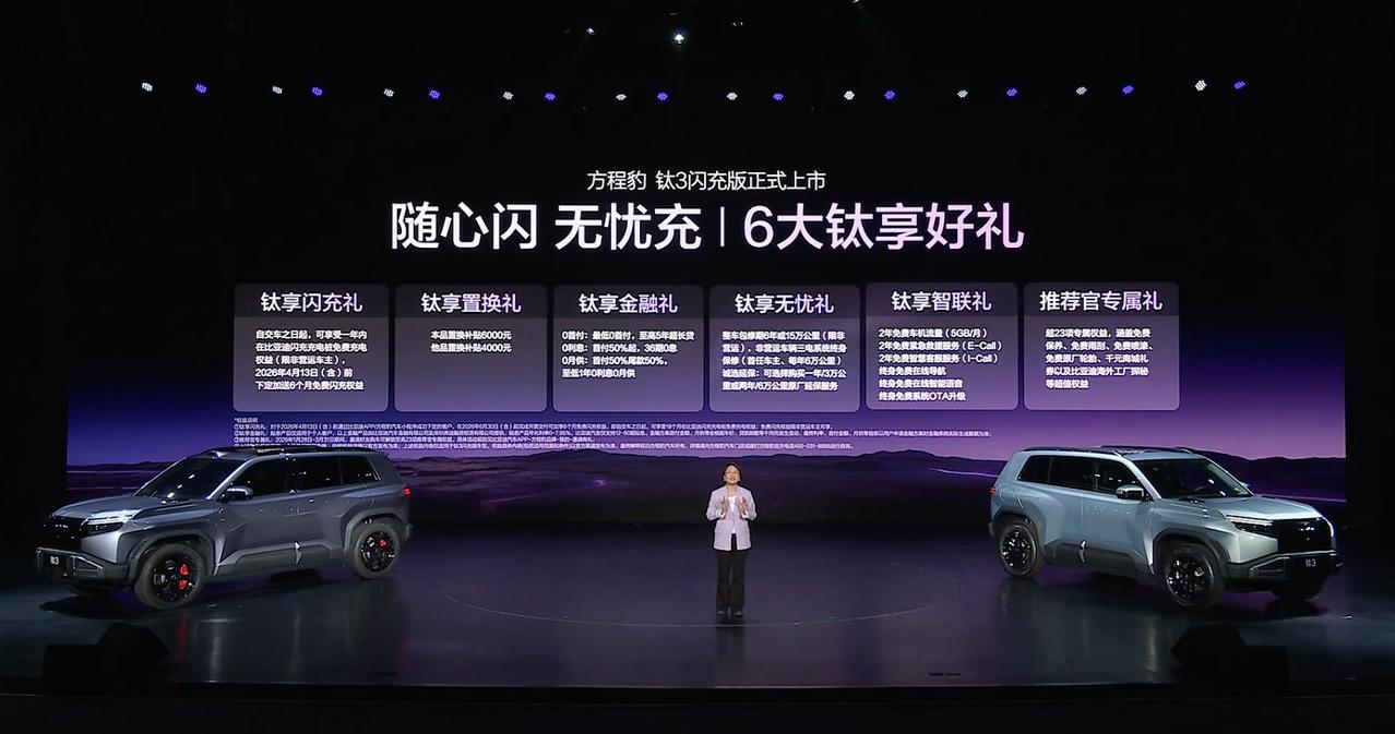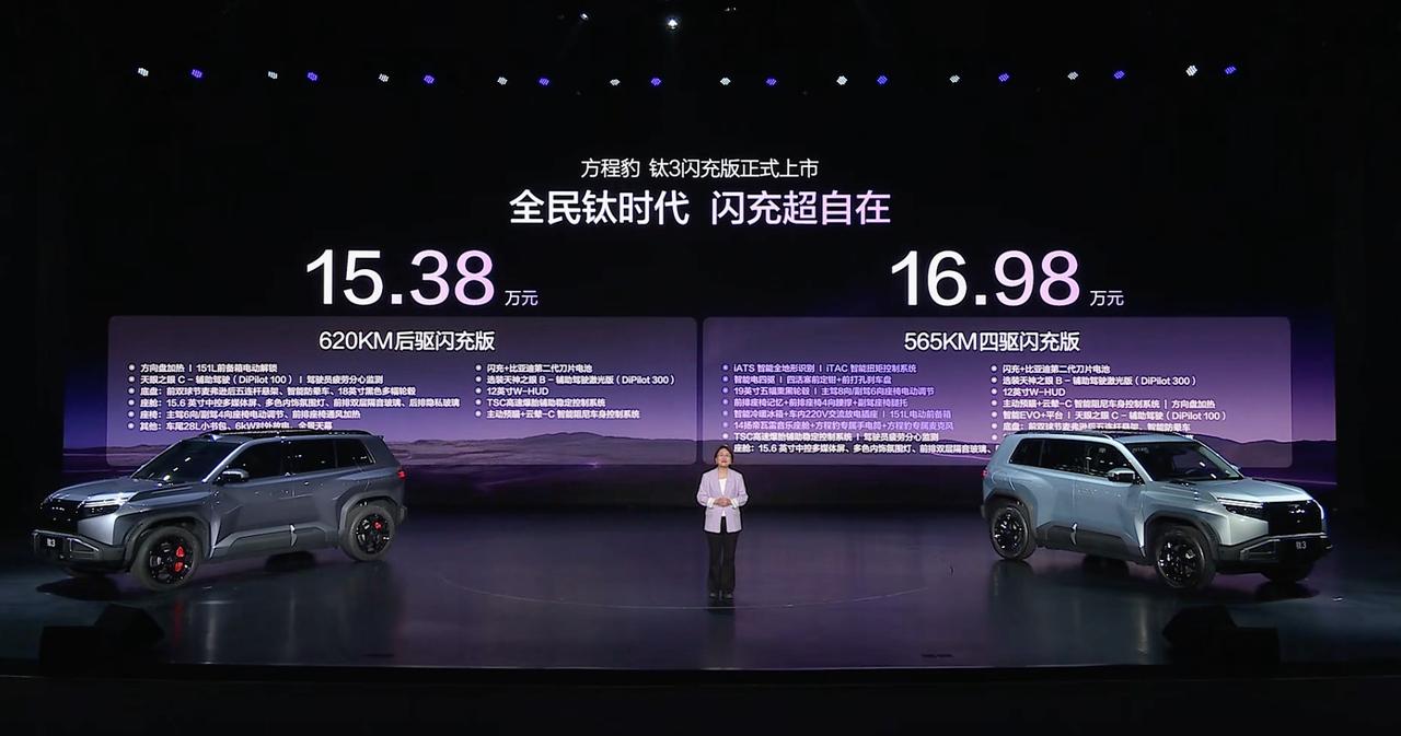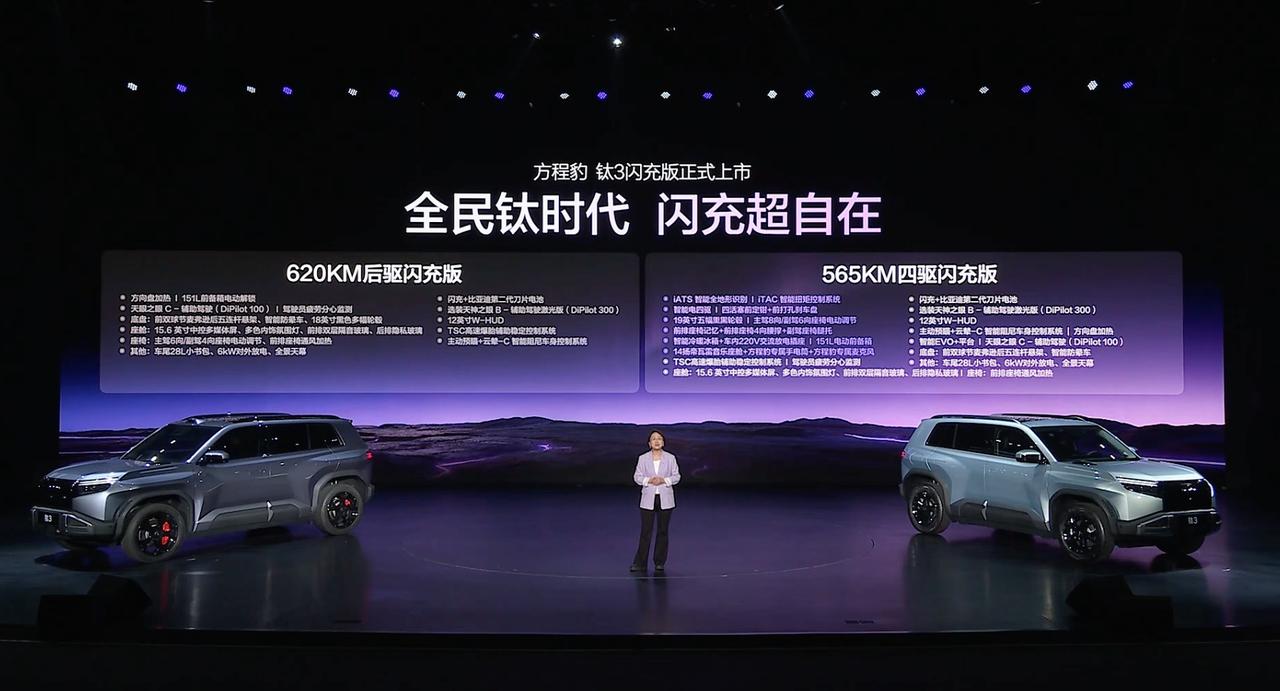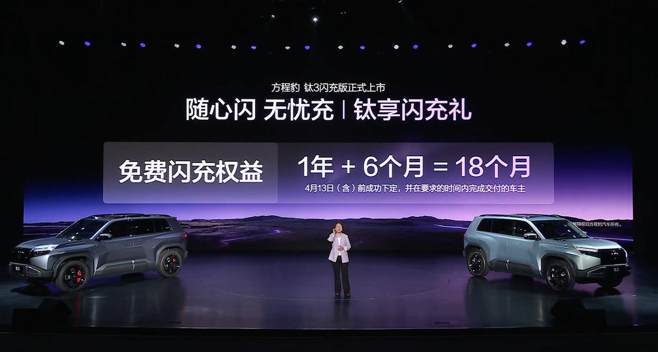 方程豹钛3闪充版:A级纯电SUV 智能EVO+平台;CTB电池车身一体化 云辇-C+主动预瞄;智能防晕车模式 可选装天神之眼B-辅助驾驶激光版 高速爆胎辅助稳定系统,最高时速140公里 620KM后驱闪充版售价15.38万元 565KM四驱闪充版售价16.98万元 4月13日前成功下定并在要求时间完成交付的车主,送18个月免费闪充权益 钛7 EV闪充版开启预订,价格为22-25万元,4月上市发布