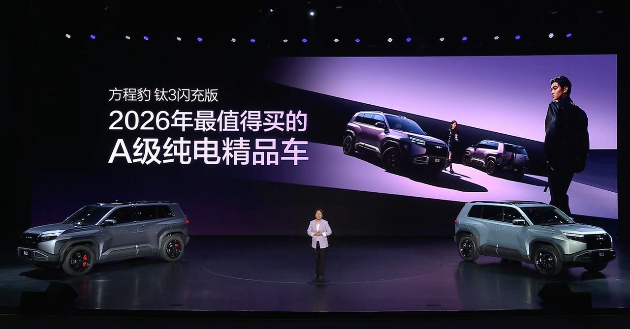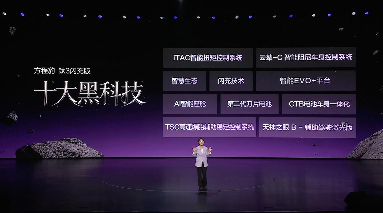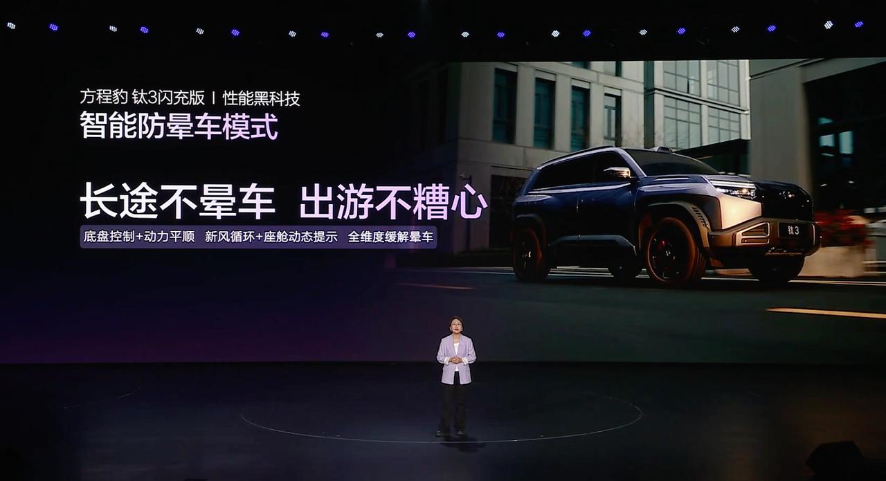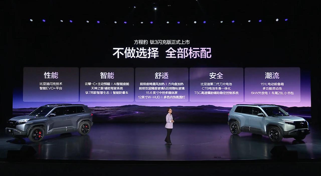方程豹钛3闪充版:A级纯电SUV 智能EVO+平台;CTB电池车身一体化 云辇-C+主动预瞄;智能防晕车模式 可选装天神之眼B-辅助驾驶激光版 高速爆胎辅助稳定系统,最高时速140公里 620KM后驱闪充版售价15.38万元 565KM四驱闪充版售价16.98万元 4月13日前成功下定并在要求时间完成交付的车主,送18个月免费闪充权益 钛7 EV闪充版开启预订,价格为22-25万元,4月上市发布