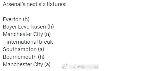 阿森纳未来6场比赛:主战埃弗顿、主战勒沃库森、联赛杯决赛对曼城、国际比赛日、客战南安普顿、主战伯恩茅斯、客战曼城。