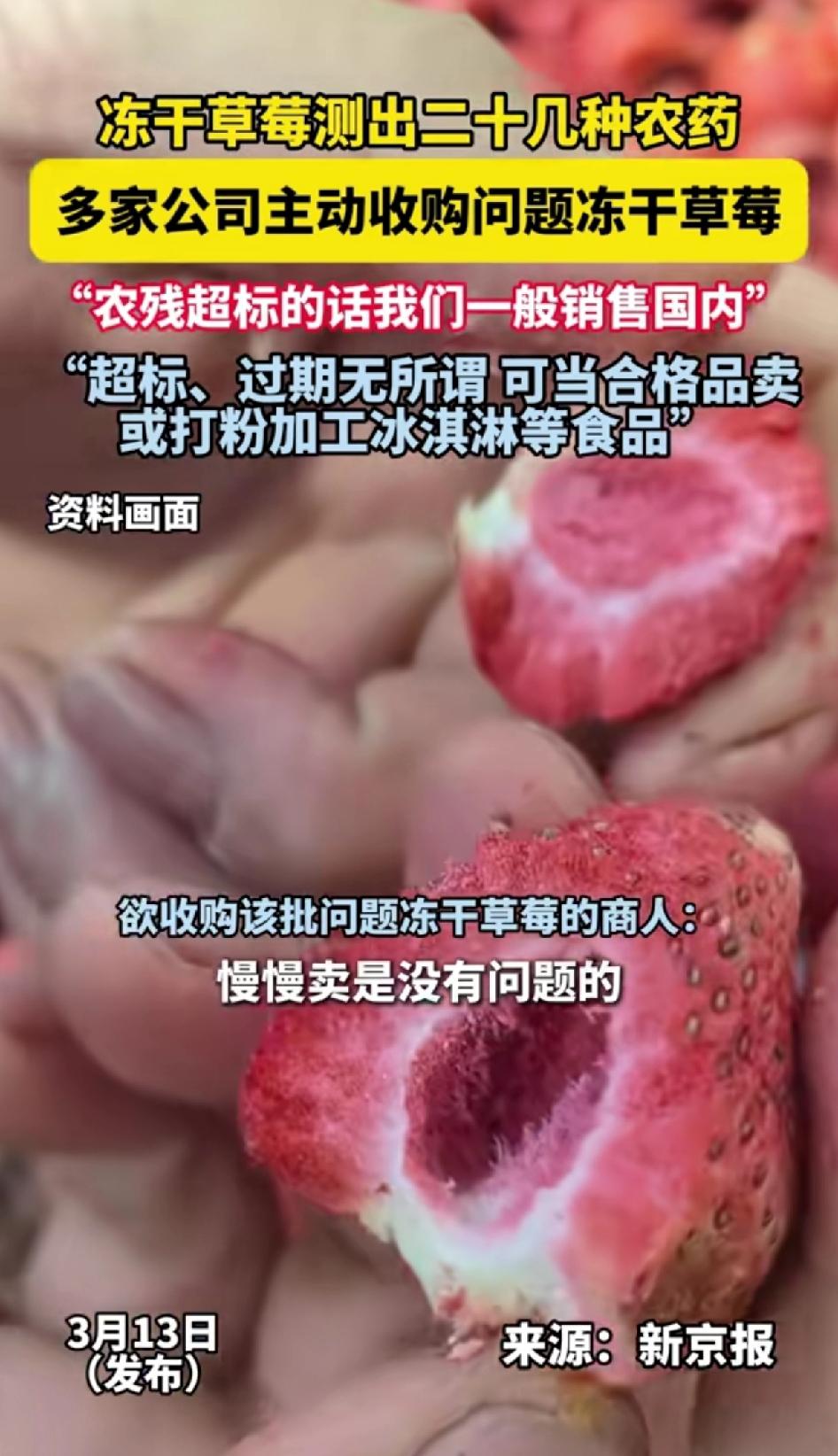 冻干草莓检测出二十几种农药,多家公司主动收购问题冻干草莓。“农残超标的话我们一般销售国内”。超标、过期无所谓,可当合格品卖,或打粉加工冰淇淋售卖。 这冻干草莓检测出二十几种农药的事儿,真让人意想不到!多家公司还主动收购问题冻干草莓,甚至说出“农残超标的话我们一般销售国内”这种话,太让人愤怒了。 这是拿监管部门不当回事,出口国外的食品都有严格执行的标准,有问题的食品销往国内就行了。外国人害不了,可以国人的健康嚯嚯。 咱消费者花钱买食品,是为了健康,可不是为了吃农药。这些公司为了利益,把农残超标的产品卖给国内消费者,这不是坑人嘛。 食品安全关乎每个人的健康,相关部门真得好好管管。希望以后能有更严格的监管,让我们能放心吃草莓,而不是提心吊胆地担心吃到农药超标的东西。