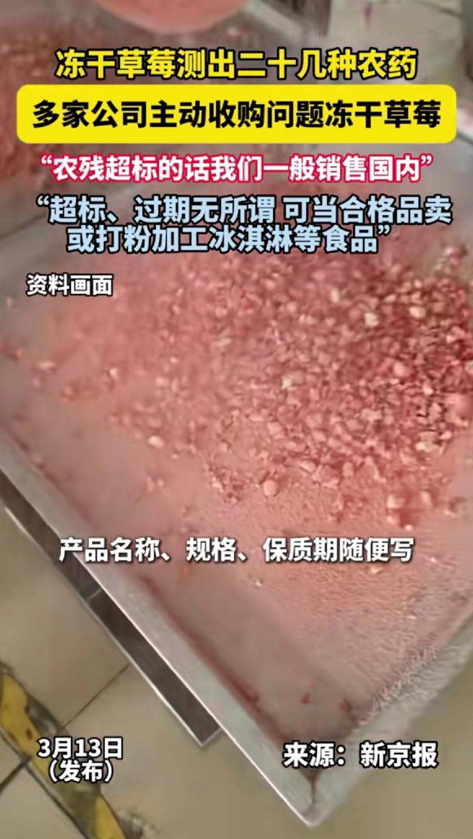 冻干草莓检测出二十几种农药,多家公司主动收购问题冻干草莓。“农残超标的话我们一般