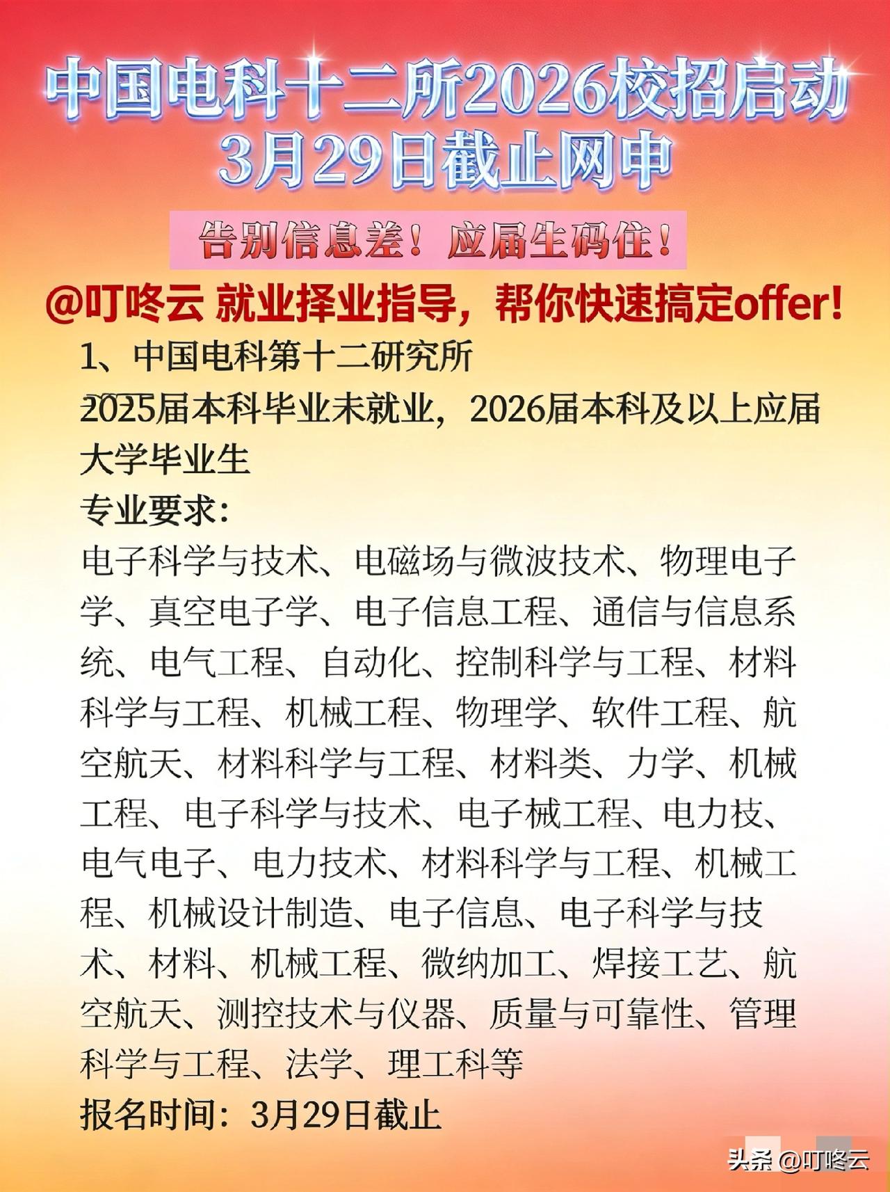 就业择业指导,帮你快速搞定offer![点亮平安灯][点亮平安灯] 一、央企科研院所的时代机遇:数据背后的择业价值 - 行业背景:在2025届全国1187万毕业生的就业浪潮中,央企科研院所凭借“稳定性+高成长+国家战略”三重优势,成为应届生择业的核心赛道。中国电科十二所作为我国微波电真空领域的“国家队”,2023-2025年校招数据显示:硕士及以上学历招录占比从78%攀升至92%,本科岗位仅保留少量核心工艺岗,这意味着高学历人才在该领域的竞争优势持续放大。 - @叮咚云 提示:2025年央企整体校招报录比约12:1,而电科十二所核心研发岗报录比约25:1,博士岗位报录比低至8:1,这意味着高学历、专业对口的应届生具备显著竞争优势,切勿因“竞争激烈”而放弃优质机会。[烟花][烟花] 二、电科十二所2026校招核心要求:从历史数据看录取规律 - 学历要求:2026校招明确覆盖“2025届本科未就业+2026届本科及以上”。 - 专业要求:电子科学与技术、电磁场与微波技术、材料科学与工程三大核心专业录取占比累计达58%。 - 时间节点:2026校招网申截止3月29日,对比2024-2025年数据,春季校招周期从45天压缩至38天,这意味着简历投递需提前10-15天准备,避免因截止时间临近而错失机会。 @叮咚云 提醒:2025年数据显示,网申前3天投递的简历通过率比最后3天高32%,尽早投递是提升成功率的关键。[礼物][礼物] 三、历史招录数据拆解:如何精准匹配岗位需求 - 专业录取优先级: 1. 电子信息类、材料类专业应届生可优先投递核心研发岗,录取概率比其他专业高52%; 2. 机械工程、自动化等专业可投递结构设计、加工工艺岗,录取率约23%; 3. 法学、管理类专业可投递纪检、质量与可靠性岗,竞争压力相对较小。 - @叮咚云 数据结论:2023-2025年,有科研项目经历、实习经历的应届生录取率比无经历者高61%,这表明“实践能力”是科研院所筛选人才的核心指标,应届生需在简历中突出项目成果、技能匹配度,而非仅罗列课程成绩。[福][福] 四、职业发展与福利保障:数据背后的长期价值 - 人才结构与晋升:电科十二所现有职工1200余人,专业技术人员占比80%以上,35岁及以下职工占比46%。 - 薪酬福利对比:2025年数据显示,硕士应届生入职起薪20-25万/年,博士25-35万/年,叠加北京户口、事业编制、住房补贴、安家费等福利,综合待遇远超互联网行业平均水平。[星星眼][星星眼] 五、应届生求职策略:基于数据的行动指南 - 简历优化:根据2025年录取简历分析,突出“专业匹配+项目经历+技能证书”的简历通过率比普通简历高45。 - 网申与时间管理:2026校招网申截止3月29日,建议应届生在3月20日前完成投递,避免系统拥堵。同时,可同步投递电科集团其他研究所(如14所、29所),形成“核心目标+备选”的投递策略,提升上岸概率。 @叮咚云 就业择业指导,将持续为你提供精准的求职信息与专业的面试辅导,助你顺利拿到理想offer![福][福] 六、总结:数据驱动下的择业决策 - 核心结论:中国电科十二所2026校招是应届生进入军工央企、实现职业理想的黄金机遇,历史数据表明:专业对口、高学历、有实践经历的应届生具备显著竞争优势,而稳定的职业发展、优厚的福利保障与国家战略级的平台,使其成为理工科应届生的优质选择。 - @叮咚云 结语:求职不是孤军奋战,我们将以专业的数据洞察与精准的指导,陪伴你走过每一步择业之路,助你在2026春招中脱颖而出,开启精彩的职业人生! 欢迎关注@叮咚云 就业择业指导,帮你快速拿到央国企offer!将优先为粉丝职业规划指导,为你定制最适合的就业择业方案!欢迎留言交流讨论。[来看我][来看我] 免责声明:图片来自网络,仅供参考 铁饭碗岗位推荐 央企铁饭碗真相 应届生就业机会央企铁饭碗真相 央国企求职招聘 央国企求职招聘