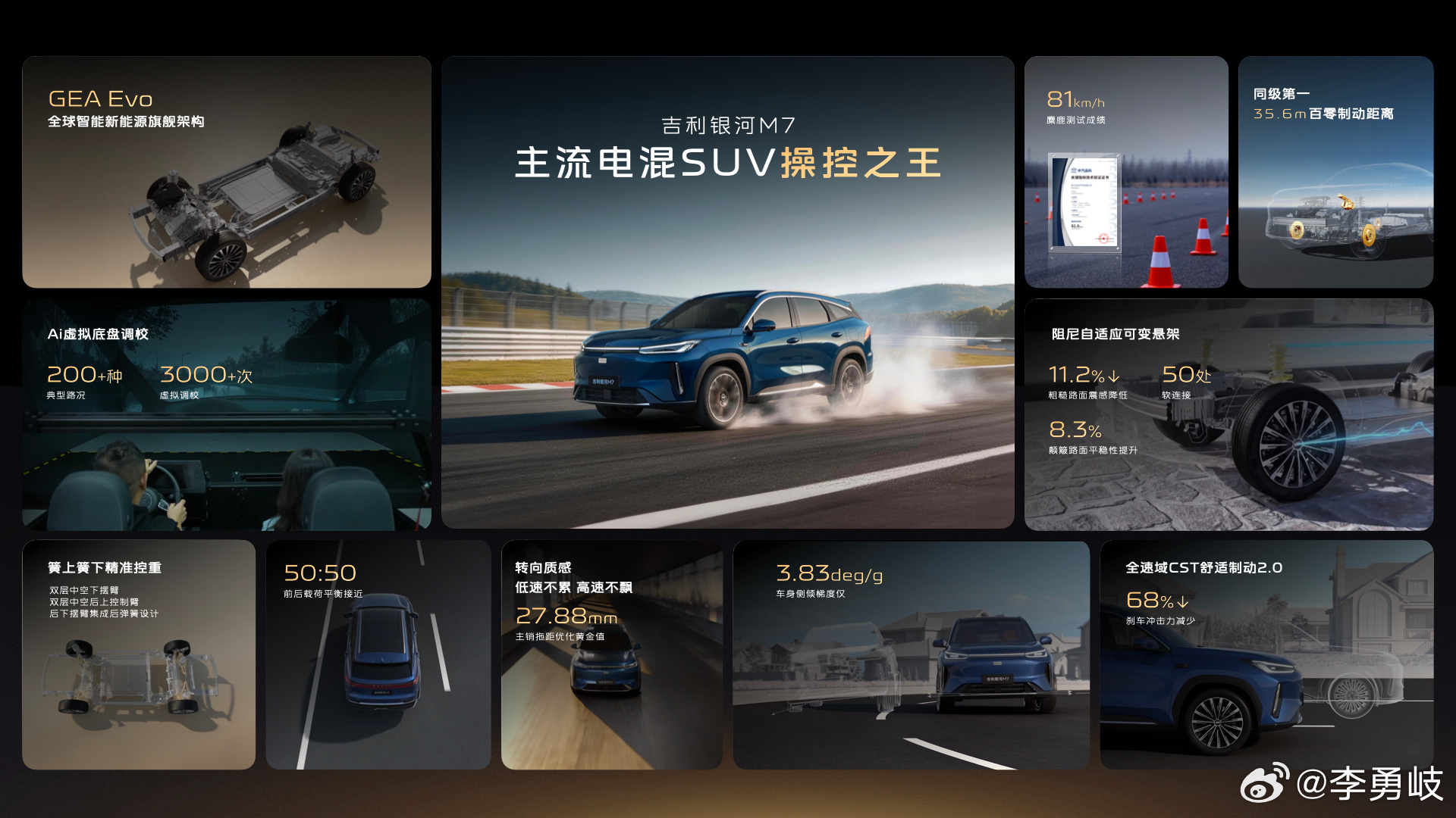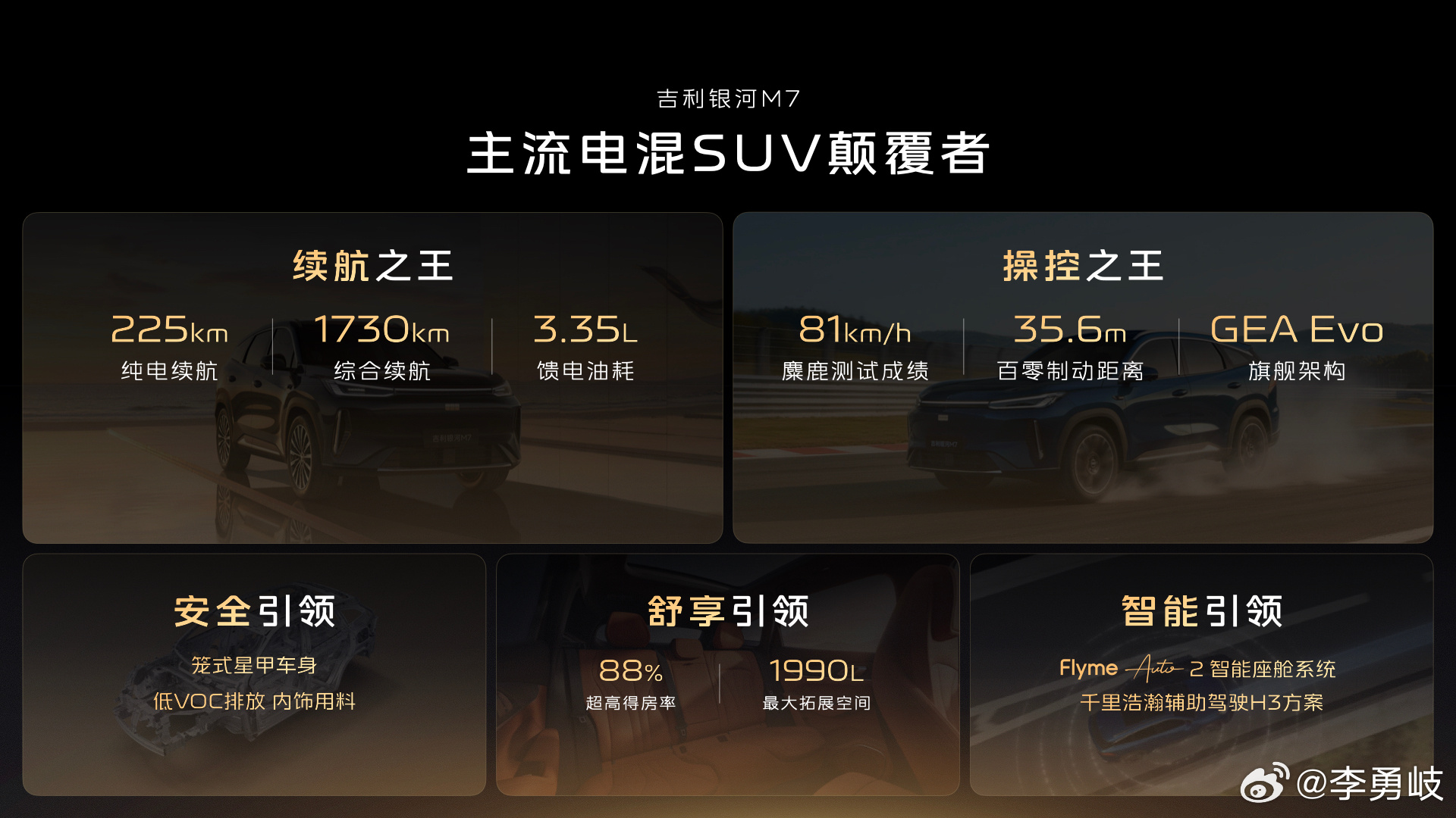 225km纯电+1730km综合续航!吉利银河M7技术首秀:首搭神盾金砖电池吉利银河M系新成员来了3月13日,吉利银河M7在吉曜通行衢州基地迎来产品技术首秀。作为吉利银河品牌M系列首款主流电混SUV,吉利银河M7传承M系列旗舰产品力,打造高价值产品。发布会现场,吉利银河正式宣布——新车将首发搭载神盾金砖电池,并以225神盾金砖电池(纯电续航至高225km,同级最高)、81麋鹿金牌驾控(麋鹿测试成绩81km/h,同级最快)、1730超长金算续航(满油满电综合续航1730km,同级最长)三大技术尖点,为用户提供颠覆主流SUV价值的卓越体验。吉利银河迈入长续航时代吉利银河M7搭载同级最大的29.8kWh混动专用电池包,电池容量较同级竞品高出约12%,搭配系统最高效率达93.1%的雷霆11合1高集成电驱,直接实现225km同级最高纯电续航。值得一提的是,银河M7配备高效热管理系统,历经百万级大数据模拟与全年道路测试,覆盖全球9000多种气候及道路组合,配合AGS智能可变进气格栅,可在散热与减阻之间实现精准平衡,最大化挖掘续航潜力。对于城市通勤用户而言,225km纯电续航足以实现“一周通勤零油耗、零充电”,让电混车拥有媲美纯电车的便捷使用体验。吉利银河M71730km金算续航+超低油耗,彻底告别续航焦虑。依托热效率高达47.26%的雷神EM超级电混专用发动机,吉利银河M7实现1730km同级最长综合续航与3.35L/100km超低馈电油耗,大幅超越同级SUV水平。神盾金砖电池电芯循环寿命更超过4500次,并通过SEI膜自修复技术实现电池与整车同寿,可以保证百万公里的行驶里程,从根本上解决用户对电池衰减与寿命的担忧。吉利银河M7的产品技术首秀,不止于一款全新车型的亮相,更是吉利银河以技术为内核,向主流电混SUV市场发起的价值颠覆。