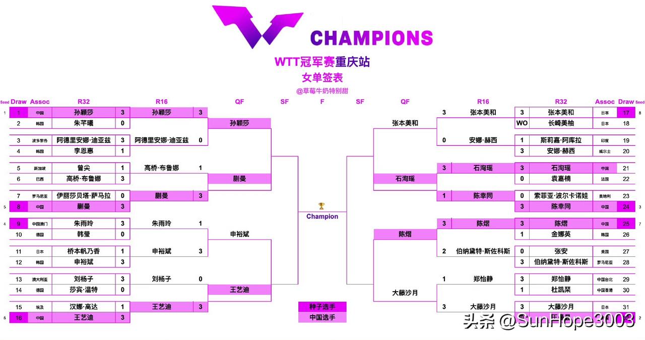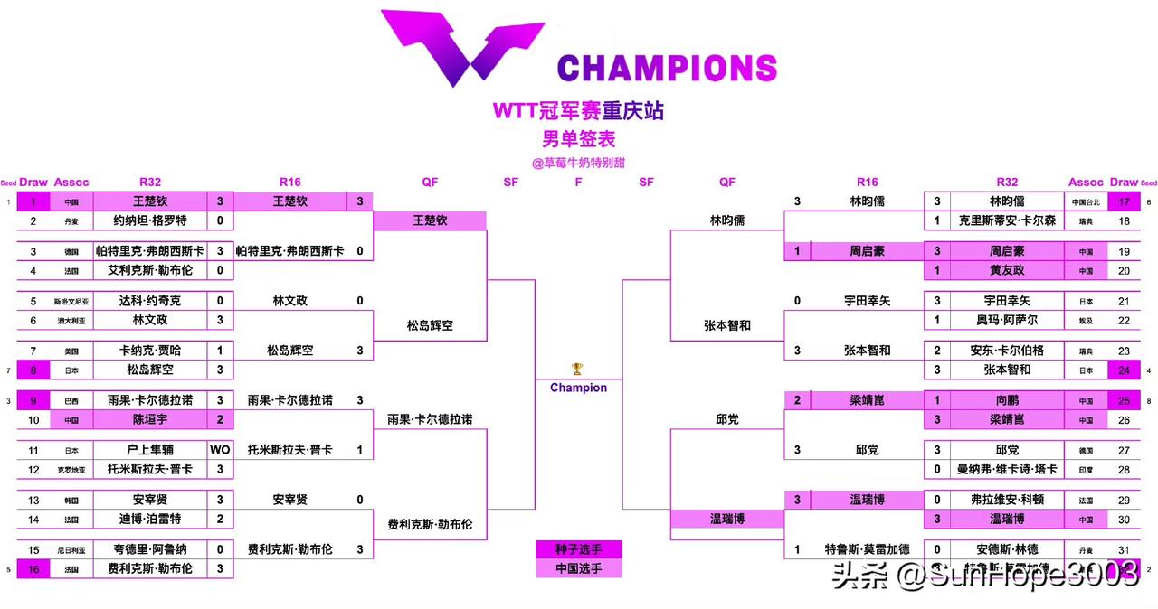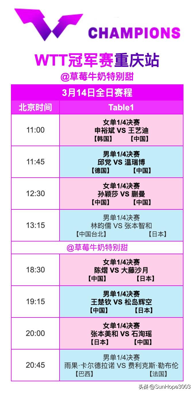 3.14日,孙颖莎王楚钦赛程表,重庆冠军赛八强出炉。 截至目前,男女单所有的1/8决赛已经完成,八强名单也产生了。 孙颖莎,蒯曼,王艺迪,石洵瑶,陈熠晋级,王曼昱,陈幸同被淘汰。 王楚钦,温瑞博晋级,陈垣宇,周启豪,梁靖崑,向鹏被淘汰。 12:30,莎莎和蒯曼,内战 19:15,王楚钦vs松岛辉空, 加油加油。 14号开始1/4决赛,15号半决赛和决赛。