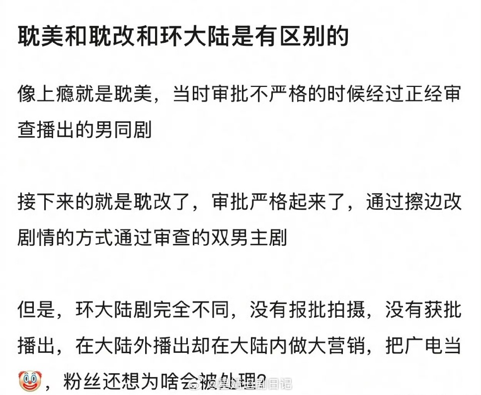 有网友说耽美和耽改和环大陆是有区别的,上瘾就是耽美,是审批不严时经过正经审查播出的剧,耽改时审批严格了,是通过擦边改剧情的方式通过审查的双男主剧,但环大陆剧不同,没报批拍摄,没获批播出,在大陆外播出却在大陆内做大营销,大家认同吗?