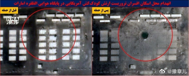 伊朗革命卫队发射的“霍拉姆沙赫尔-4”重型中程弹道导弹抵达阿联酋阿尔达法空军基地美军军营的地方形成了一个十米深的弹坑。