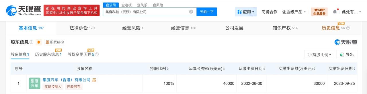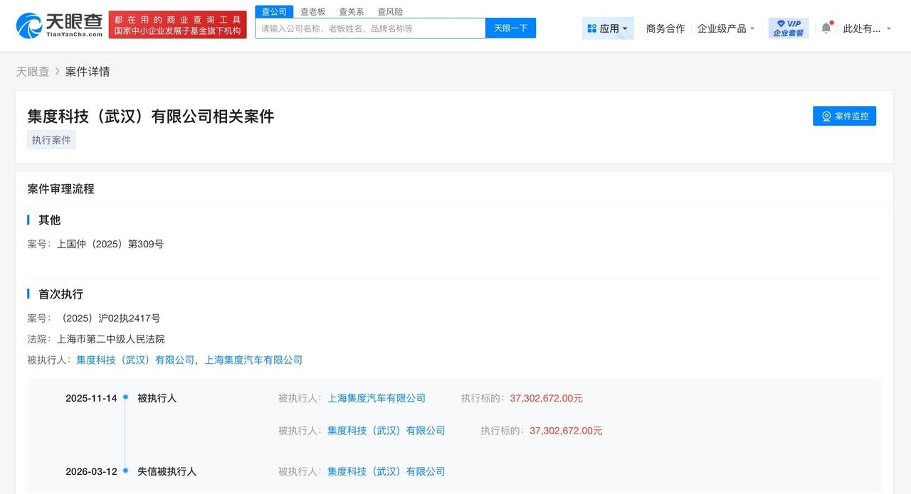 集度科技武汉公司被列为老赖 天眼查天眼风险信息显示,近日,集度科技(武汉)有限公司因有履行能力而拒不履行生效法律文书确定义务,被上海市第二中级人民法院列为失信被执行人(老赖),履行情况为全部未履行。案件流程信息显示,去年11月,该公司被执行3730万余元。 集度科技(武汉)有限公司成立于2022年11月,法定代表人为夏一平,注册资本4亿美元,经营范围包括技术服务、技术开发、技术咨询、技术交流、技术转让、技术推广,新能源汽车整车销售,软件开发等。股东信息显示,该公司由集度汽车(香港)有限公司全资持股。公开资料显示,集度科技为百度与吉利合资的智能汽车品牌“极越汽车”关联公司。 天眼查信息: