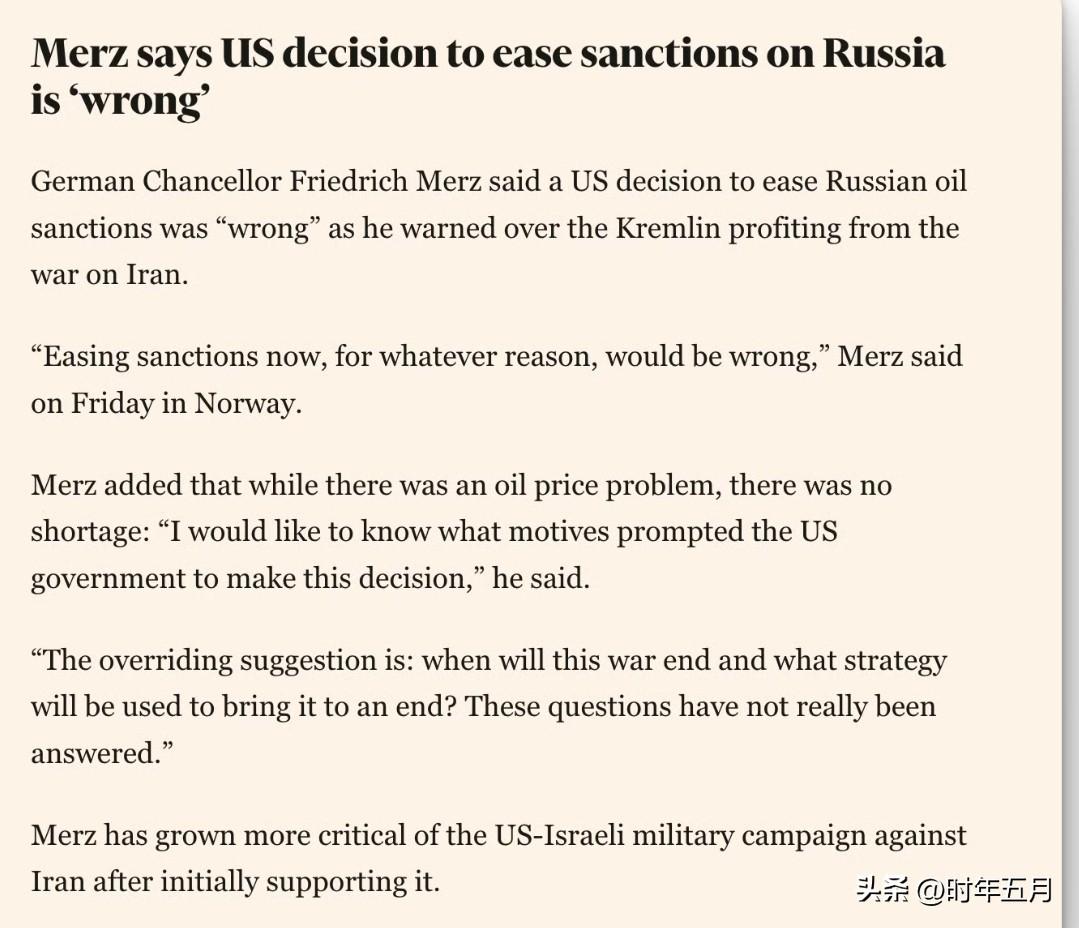 德国总理默茨抨击美国放松对俄罗斯石油制裁的“错误”决定。 德国总理默茨表示,美国放松对俄罗斯石油制裁的决定是“错误的”,并警告称克里姆林宫正从对伊朗的战争中获利。 默茨周五在挪威表示:“无论出于何种原因,现在放松制裁都是错误的。”虽然存在油价问题,但并不短缺:“我想知道是什么动机促使美国政府做出这个决定,”他说。“最关键的问题是:这场战争何时结束?将采取何种战略来结束这场战争?这些问题至今仍未得到真正解答。”