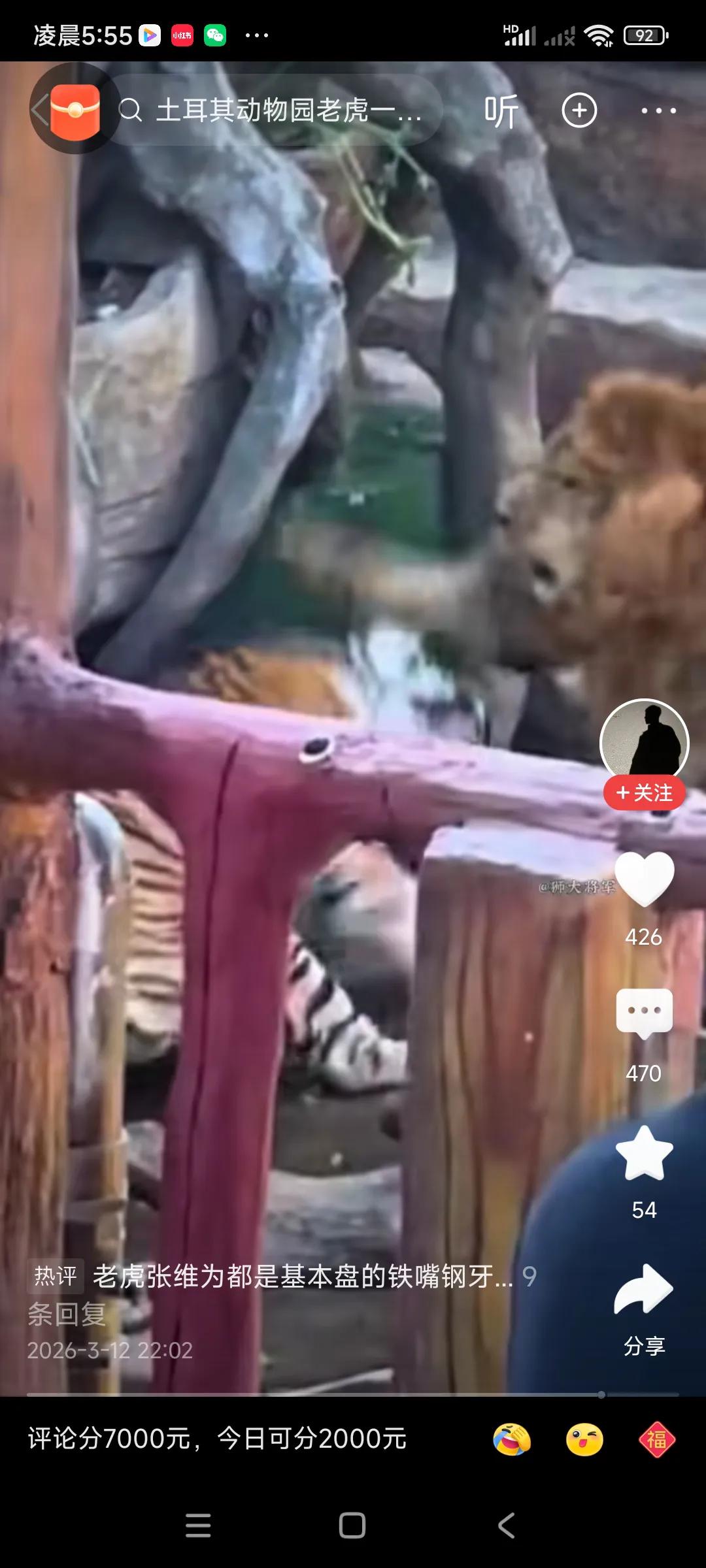 虎狮大战,老虎吃了大亏,挨了几次狮拳,他们实力其实差不多,[捂脸][捂脸] 主要原因,有几个,,, 一,雄狮一往无前,他是狮王,保护狮群,打胜才能继续当狮王,无退路可言,, 二,狮子有一个狮群,只有母狮才捕猎,他平时啥也不干,养精蓄锐,只是关键时候才出手,出手狠啊,, 三,狮子在非洲,实战经验多,与野狗,野猪,河马,鳄鱼,经常发生生死大战,一天打几次架,,,,