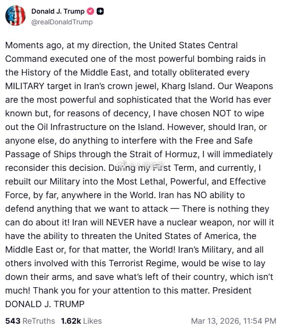 在我的指示下,美国中央司令部发动了中东历史上最猛烈的轰炸袭击,彻底消灭了伊朗王冠上的明珠——哈格岛上的所有军事目标。