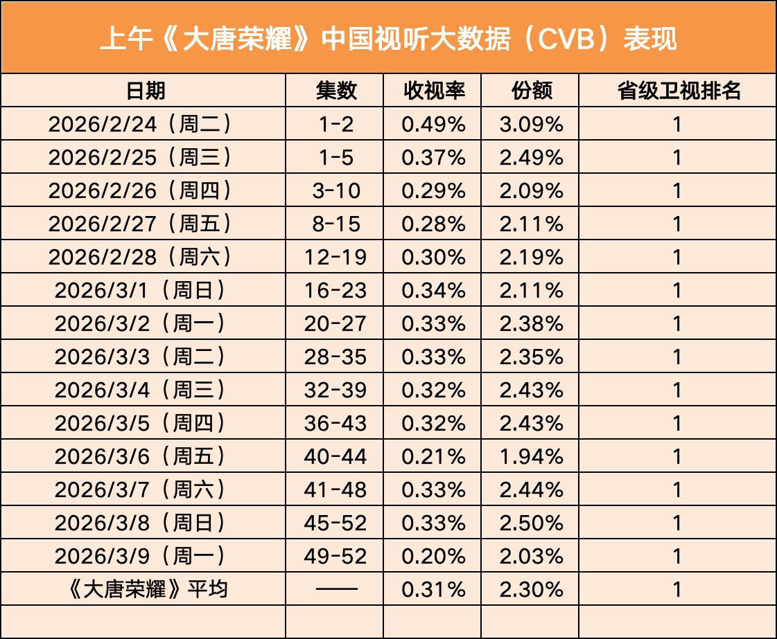 9年后大唐荣耀重播收视还是第一 收视断层领先!《大唐荣耀》重映14连冠,份额超3%,远超同期剧集,老剧的长尾魅力太绝了!大唐荣耀重映收视14连冠