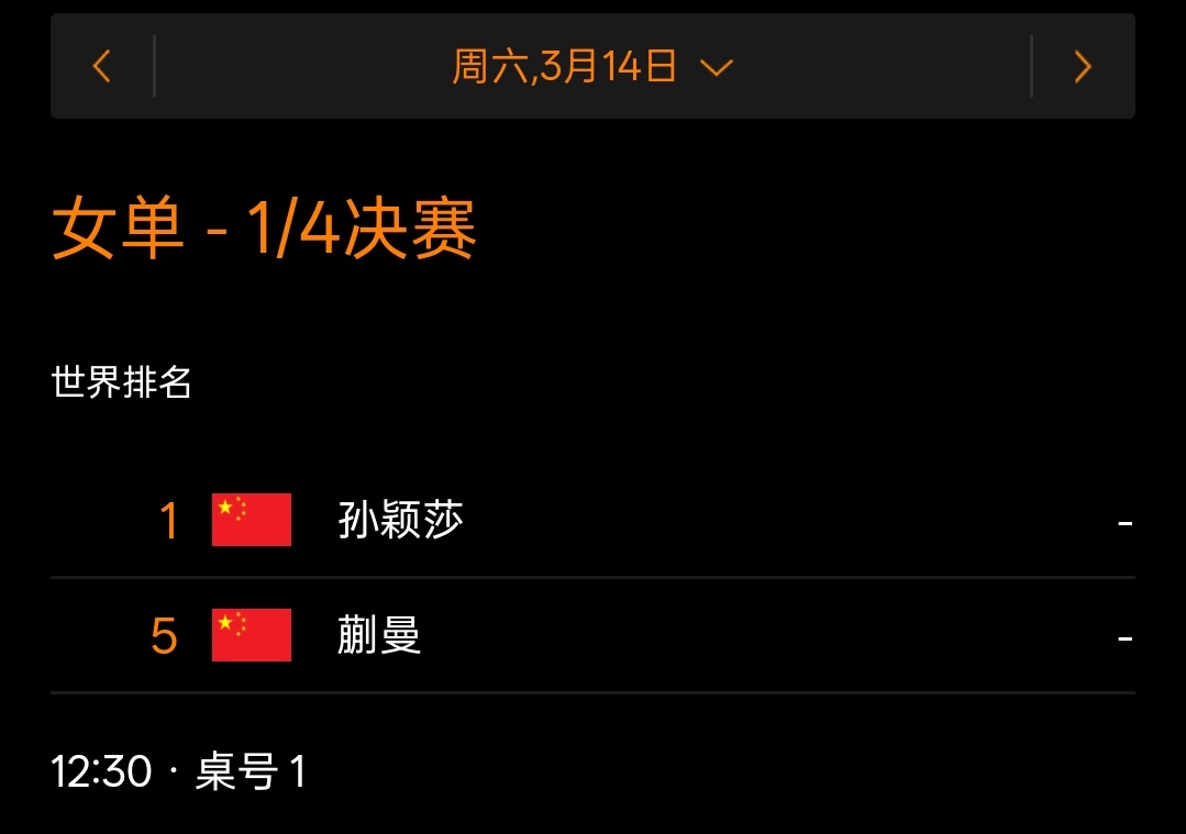 WTT重庆冠军赛2026今日赛事 🏓孙颖莎 2026WTT重庆冠军赛女单1/4决赛孙颖莎🇨🇳VS蒯曼🇨🇳03.14 ⏰ 12:30 一号台一人一句孙颖莎健康完赛,一切顺利!⛽