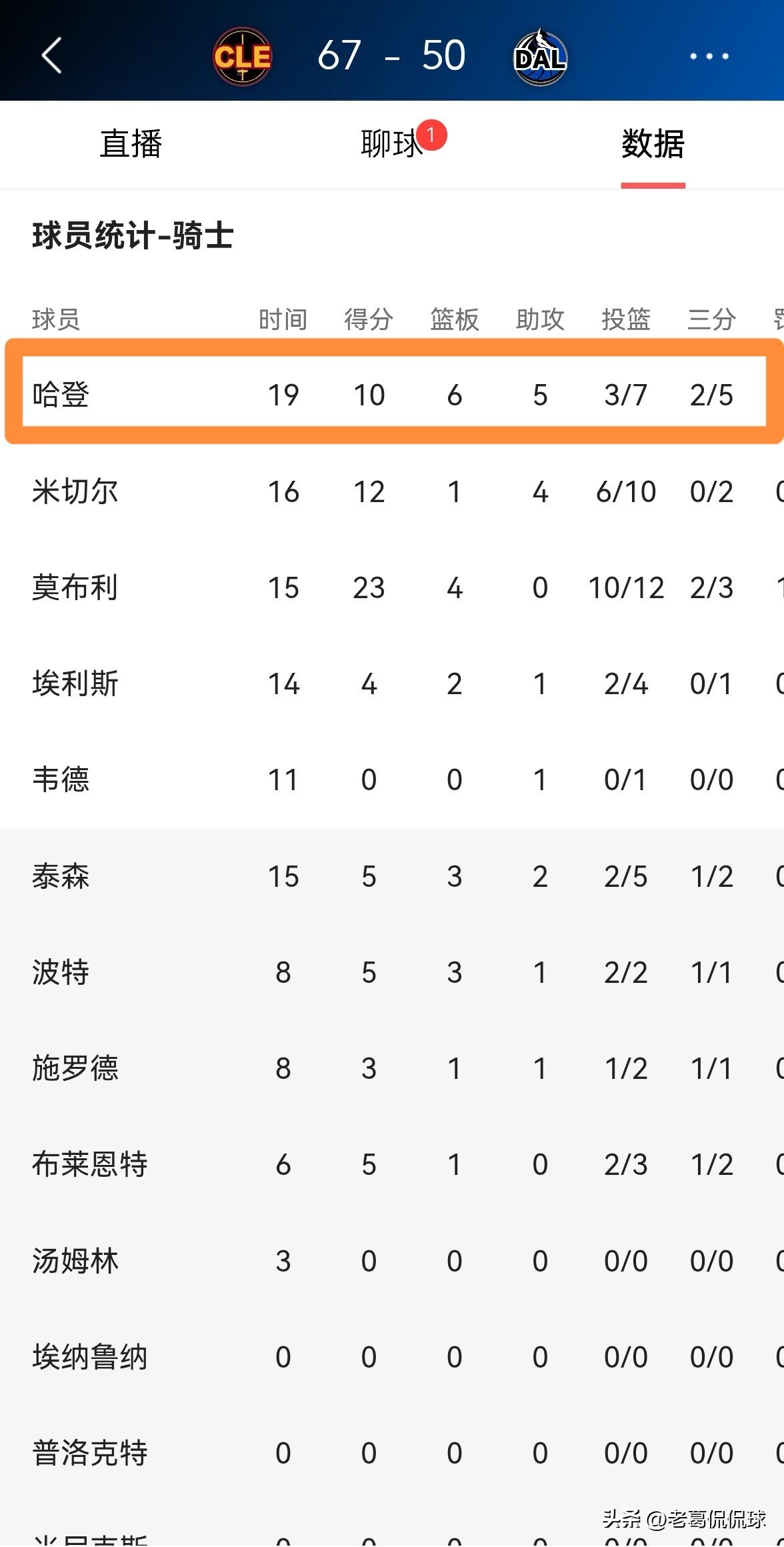 骑士巨星哈登不愧是一名全能型后卫!在今天骑士客场挑战独行侠的比赛中,目前双方半场战罢,骑士以67:50领先对手17分。值得注意的是,在前两节比赛中,哈登将自己的全面性展现的淋漓尽致,他在首发出战的19分钟里,投篮7中3,其中三分球5中2、罚球2中2得到10分6篮板5助攻1抢断,他的场上正负值为全队最高的+21。 以哈登在上半场比赛中的全面表现来看,不出意外的话,本场比赛哈登将会轻松砍下三双。
