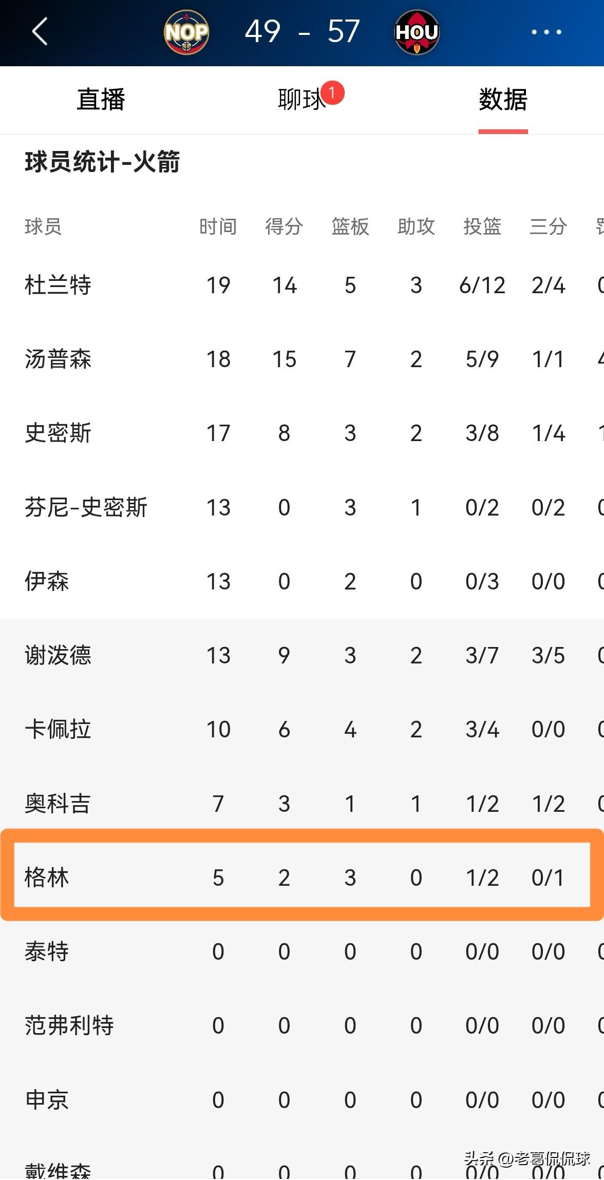 火箭老将杰夫-格林终于被重用了!在今天火箭主场迎战鹈鹕的比赛中,目前双方的上半场比赛已经结束,火箭以57:49处于领先。让人感到非常惊喜的是,在前两节比赛中,39岁的格林竟然进入到了球队的常规轮换阵容里,他在替补出战的5分钟里,投篮2中1得到2分3篮板1盖帽,他的场上正负值为+1。 事实证明,虽然杰夫-格林已经39岁了,但是他的油箱里还有不少油,只要火箭能够重用老格林,老格林就不会让球队失望。