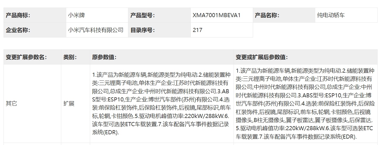 新一代小米SU7选装变更公示:最高5个激光雷达!