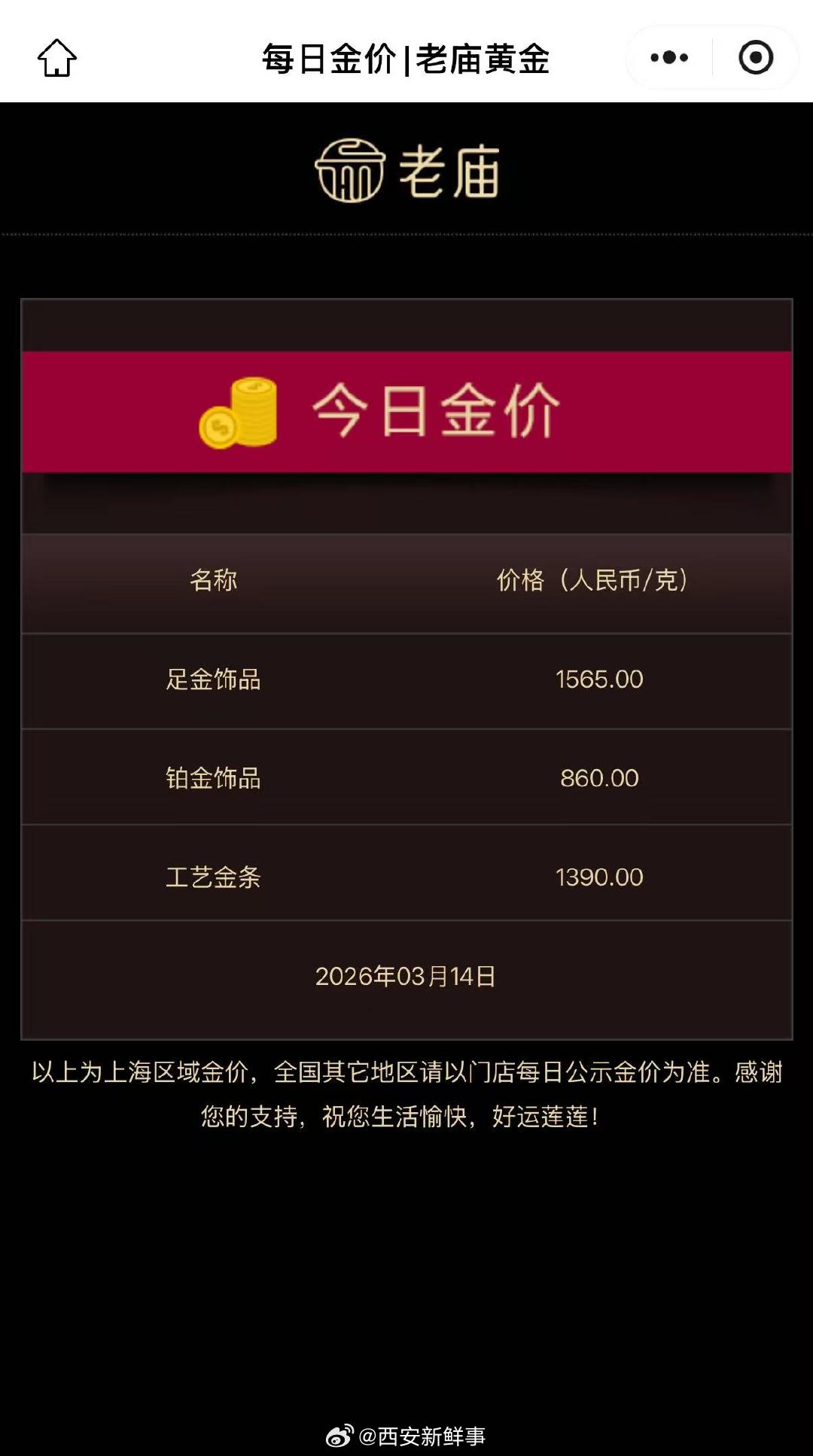 国内金饰方面,老庙昨日足金报价1570元/克,今日报价1565元/克,一夜跌了5元/克。