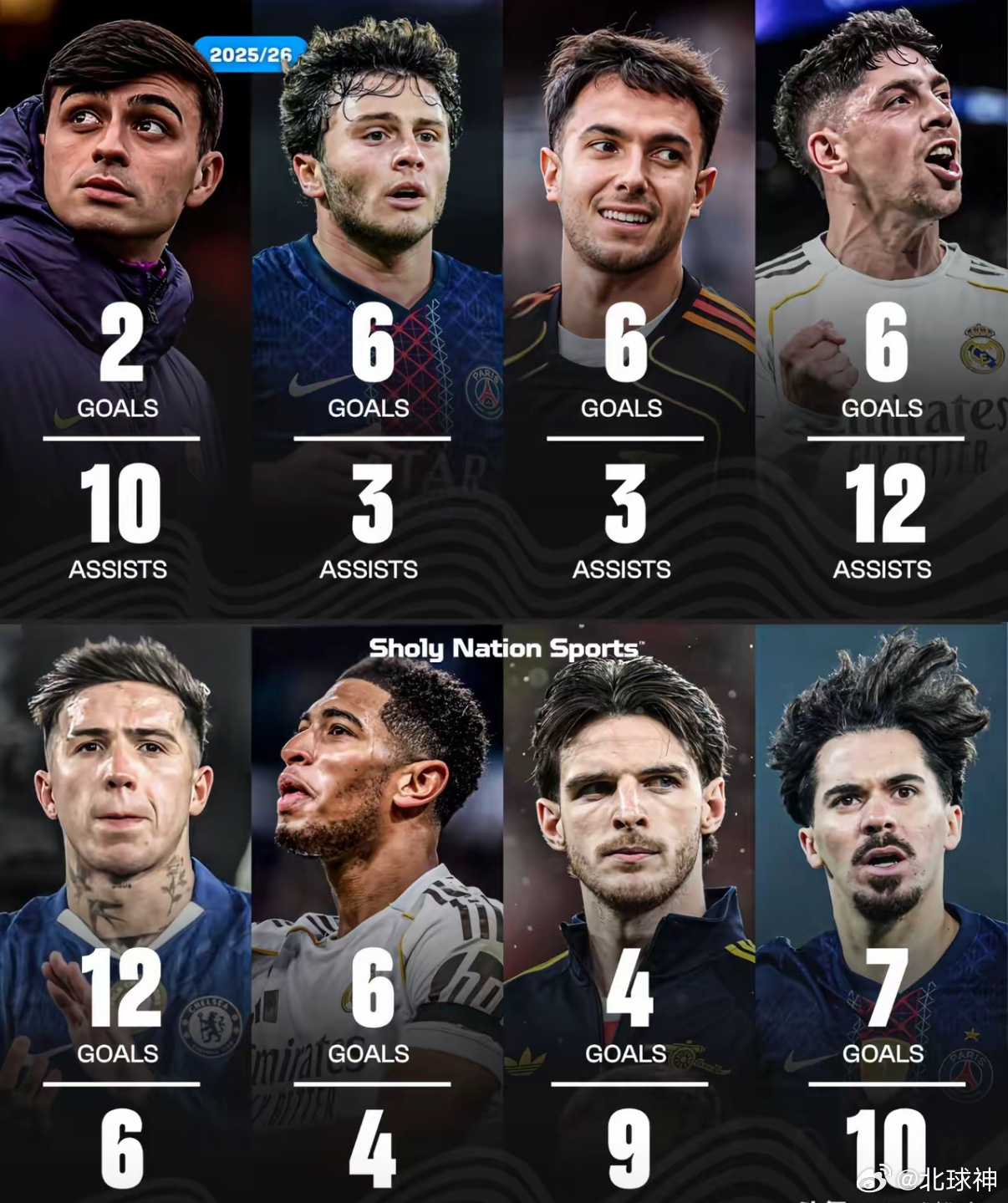 🇪🇸 佩德里:2球,10助攻🇵🇹 若昂·内维斯:6球,3助攻🇪🇸 苏维门迪:6球,3助攻🇺🇾 巴尔韦德:6球,12助攻🇦🇷 恩佐·费尔南德斯:12球,6助攻🏴 贝林厄姆:6球,4助攻🏴 德克兰·赖斯:4球,9助攻🇵🇹 维蒂尼亚:7球,10助攻