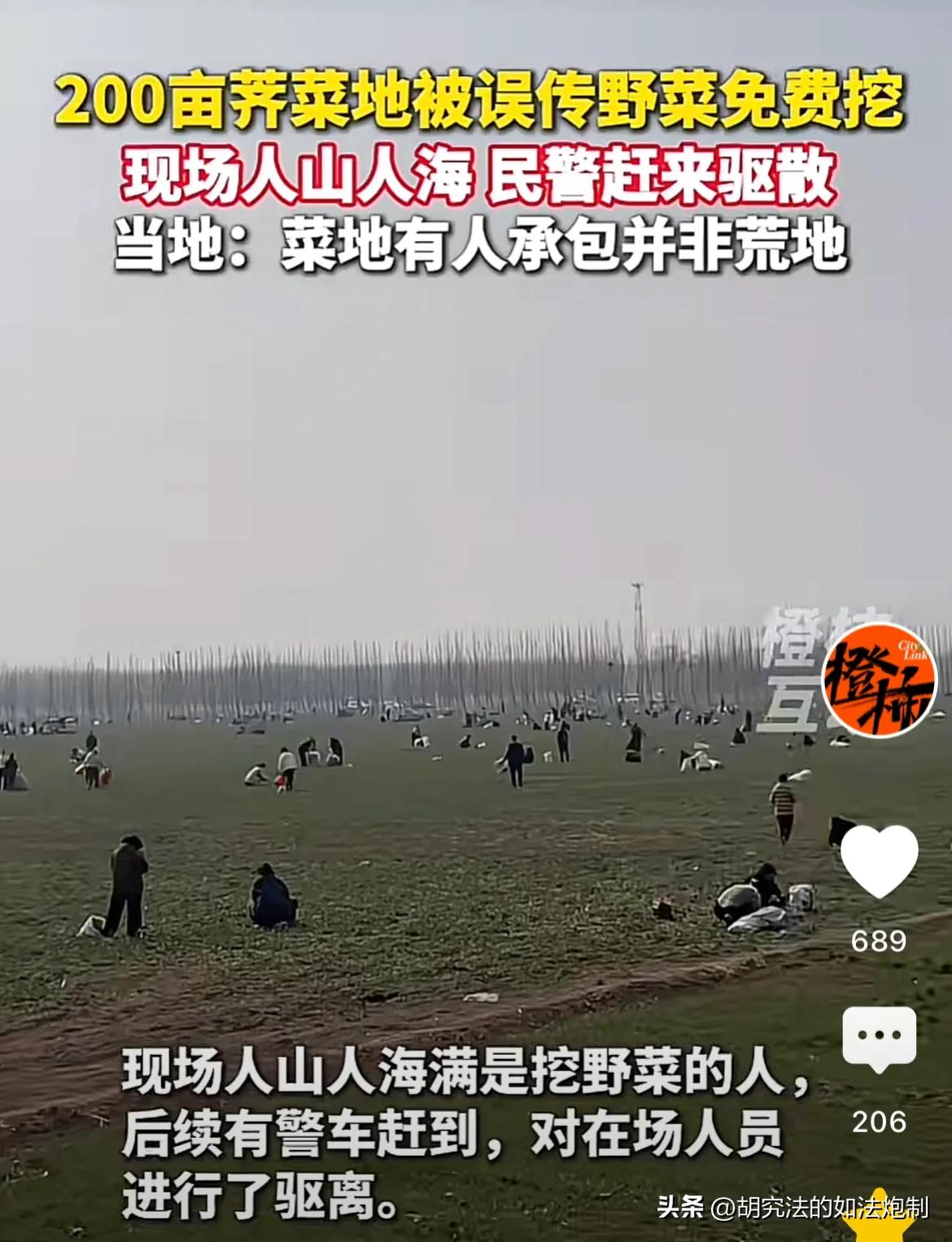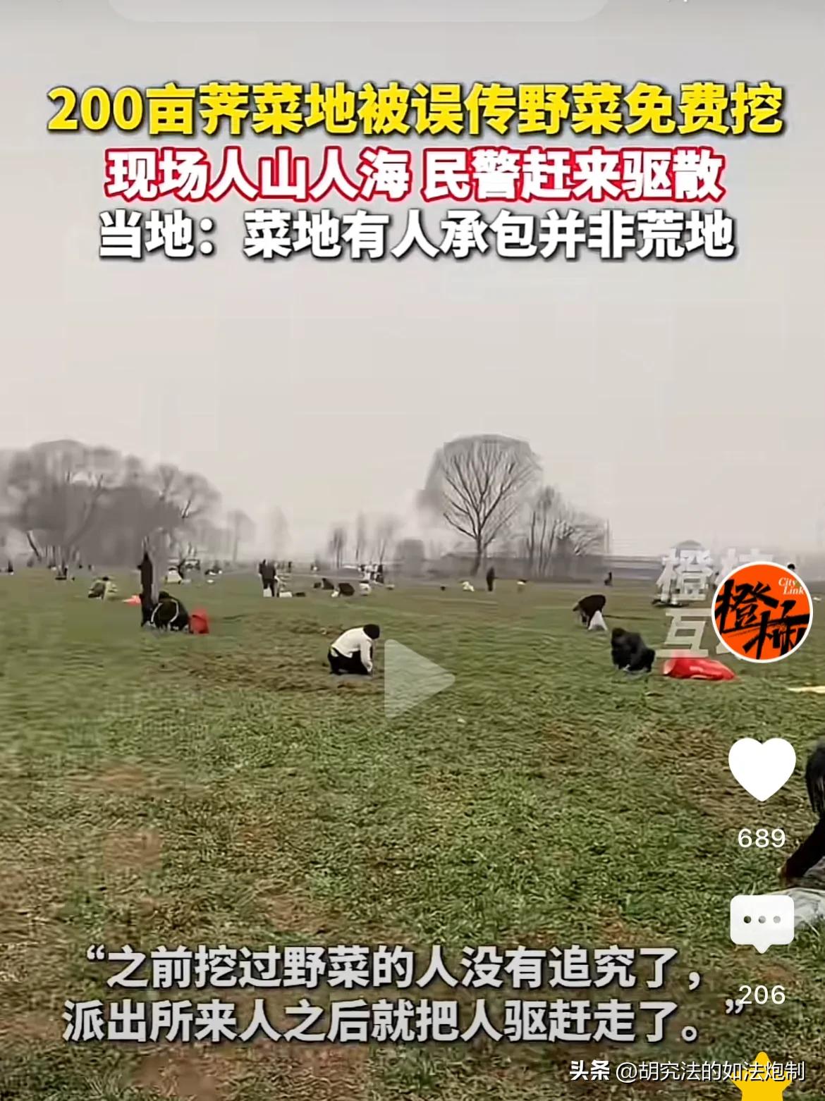 真是太坏了!河北,一男子承包200亩地种荠菜,谁知被他人发帖称“可以免费挖野菜”,结果引来很多人挖荠菜。报警后,民警对挖野菜的人进行驱赶。网友:这种事年年发生! 随着天气渐渐回暖,田间地头就会长出一种绿油油的野菜。很多人认为野菜营养价值高,而且纯绿色无公害,深受大家的喜爱。 河北一男子也正是看中了这一商机,专门承包了200亩地用于种荠菜。 本以为能大赚一笔,没想到却赔了个血本无归。 按理说,像荠菜这种植物,不用施肥,不用打药,可以说沾土就能活,几乎没有什么成本,为什么还会赔钱呢? 男子起初也以为是这样,可等种子撒下去,荠菜长出来之后,结果跟想象中的完全不一样。这些荠菜要么长得太小,要么就叶子发黄,一副营养不良的样子,根本就没有什么卖相,更别提会有什么好价钱了。 可男子也没有这方面的管理经验,心里干撒急,却没有任何办法,最后索性让这200亩的野菜自生自灭了。 结果就给自己惹来了大麻烦。 原来,有一位“热心”网友不知道出于什么样的心理,在发现这一片野菜地之后,以为没有人管理,于是便发帖称“这里可以免费挖野菜”,发完帖之后还贴心的备注上了位置。 帖子一经发出,立刻引起附近人的关注。 野菜吃起来确实美味,奈何喜欢吃的人太多了。可野菜的数量就没那么多,要是去晚了,连根儿都剩不下。 这么一个好地方,必须要抓紧时间去! 结果,附近的人拿着铲子和袋子,匆匆忙忙的就来到了那片野菜。当他们看到那一片绿油油的荠菜,心里的激动也难以掩饰。 一传十十传百,来挖野菜的人越来越多。为了能多挖一些野菜,大家恨不得一只手当成两只手来用,生怕野菜被别人挖走了。 大家挖的起劲,可就苦了承包这片地的男子。而当地的村委在了解情况后,连忙打电话报了警。 虽然民警已经对挖野菜的人进行了驱赶,可惜就有不知情的人提着袋子拿着工具慕名而来。 为了尽可能的减少损失,当地村委只能站出来喊话解释说明:菜地并非无人管理,而是有人承包的荠菜地。之所以会让人误以为是野菜地,主要是年前因管理不善,导致没有采摘售出。 “真是太坏了,这种事情发生很多,起了人家承包的土地辛苦种植了几个月,成熟的时候整个村的人去哄抢,简直就是土匪!” “难道野生的和自种的都分不出来?那么一大片土地只长荠菜本身就不合理,视频的发布者以及去挖野菜的人,纯粹就是抱着占便宜的心理去的!” 《民法典》第二百六十七条规定,私人的合法财产受法律保护,禁止任何组织或者个人侵占、哄抢、破坏。 男子承包200亩地,用于种植荠菜,这属于他私人的合法财产,受到法律的保护。 不过话又说回来了,男子的损失是肯定。不管大家是出于什么样的心理来挖野菜,可是让一个人卯足劲了,挖也挖不了多少,根本还达不到处罚的标准,民警也只能进行驱赶。 可问题的关键,来免费挖野菜的人实在太多,就算是一个人一袋子,那200亩地根本就经不住挖。 作为承包人,这个损失到底应该由谁来承担? 对此你怎么认为?
