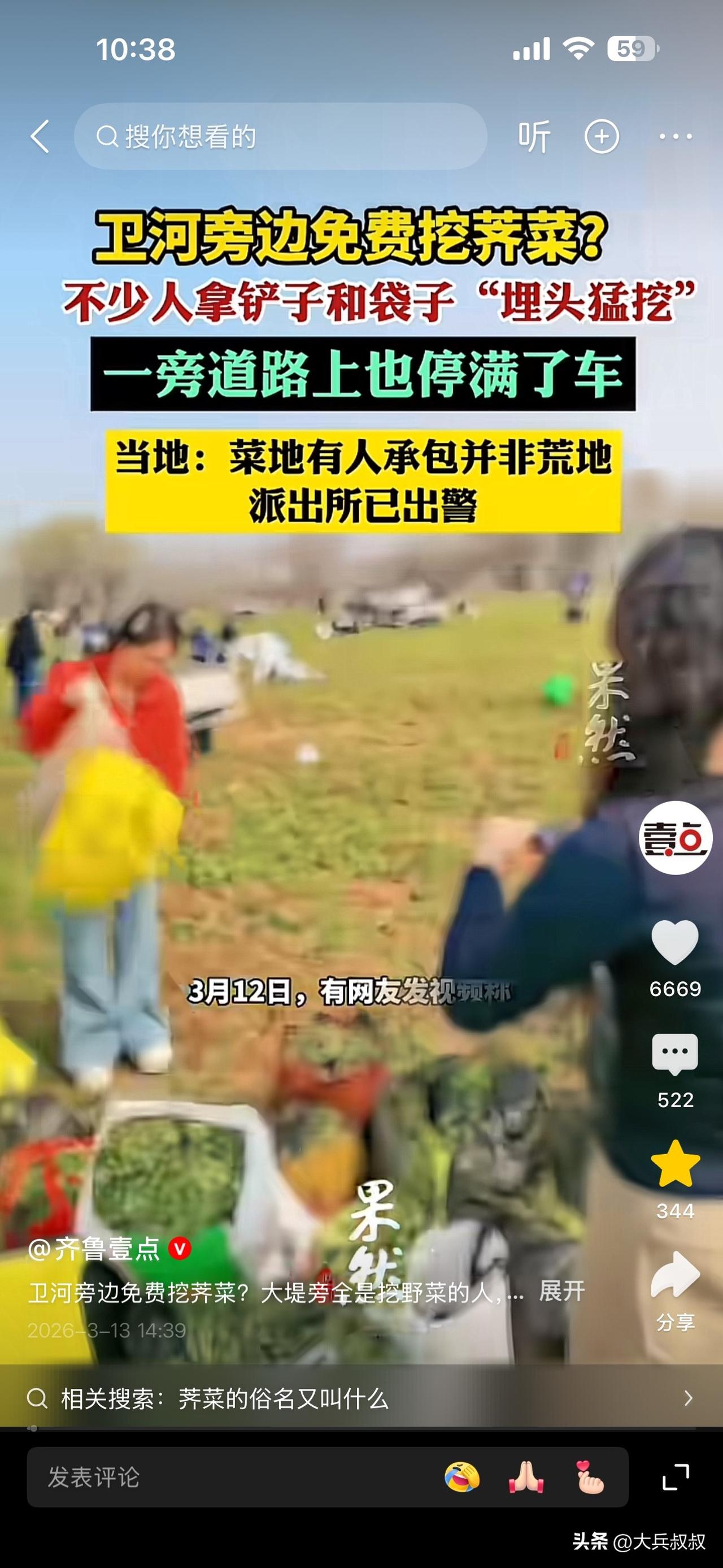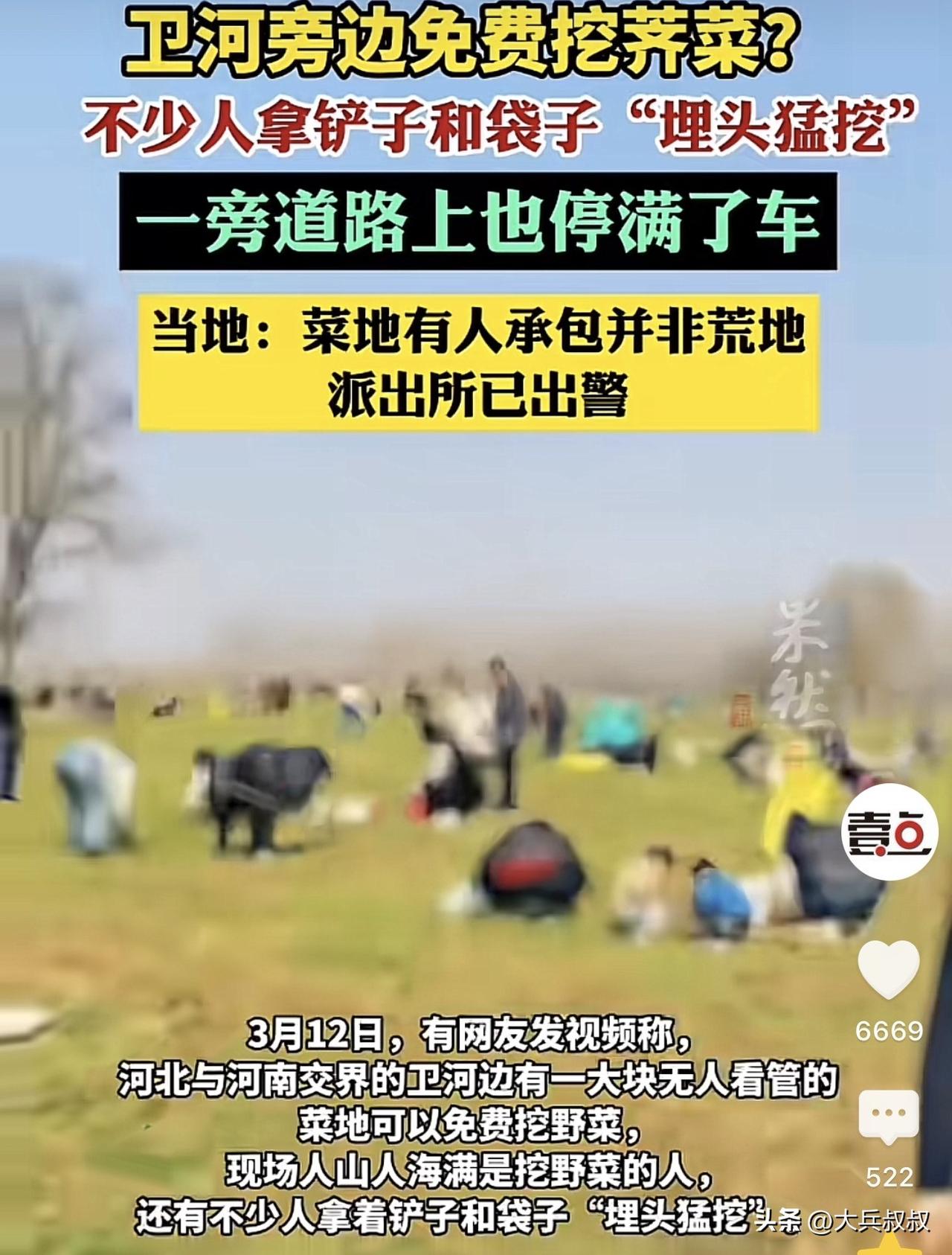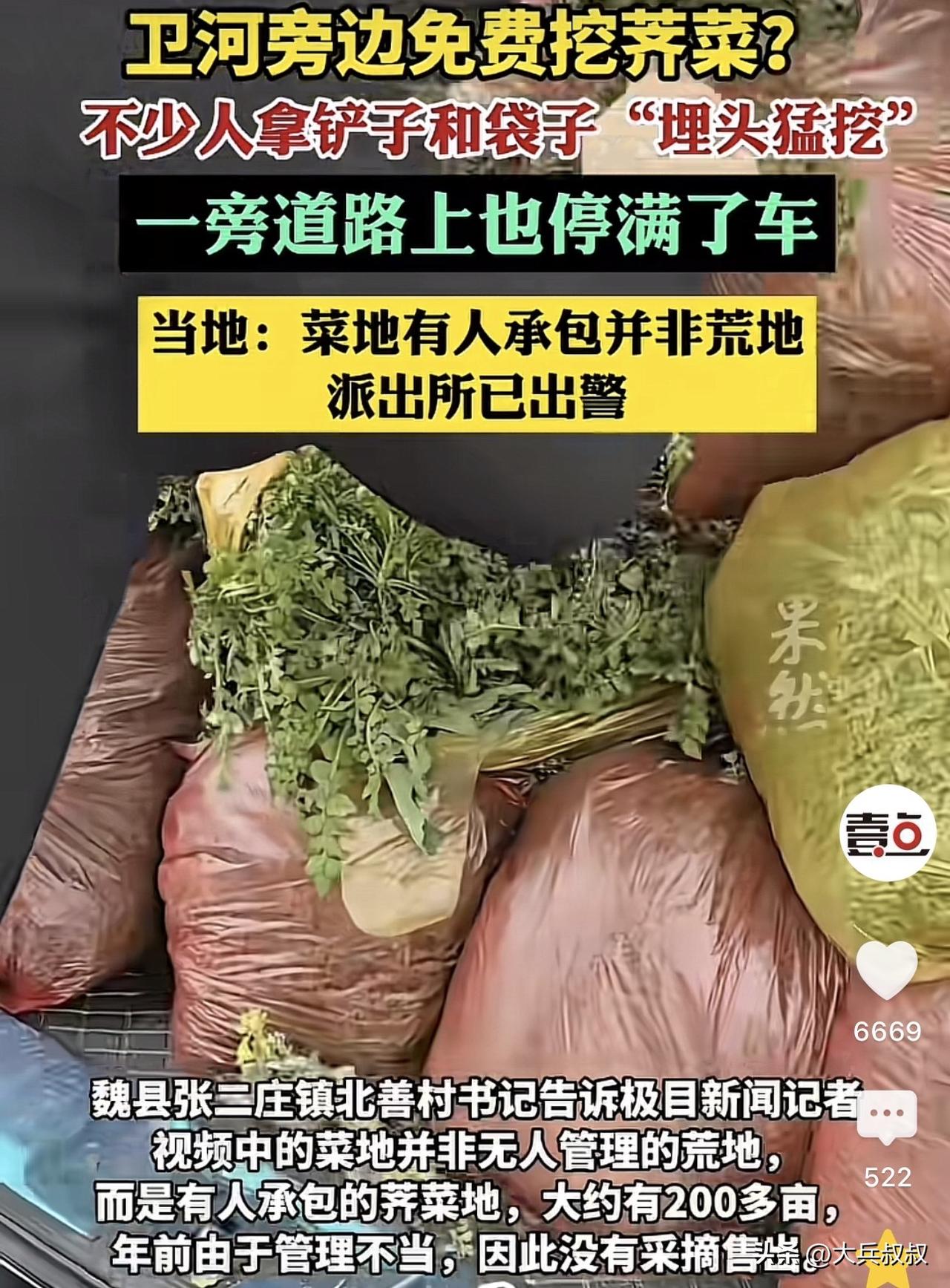 河北,一处200多亩菜地长满了荠菜,因为长势良好却无人管理,于是,有网友在网上发消息称可以免费挖野菜,结果一传十、十传百,很快就聚集了很多挖野菜的村民,因为挖野菜村民多,部分区域都已经被挖空。然而,事发后,当地却表示,这片菜地是有人承包的,荠菜也是人家种植的并不是荒地。网友,这些在网上说免费的,应该一律抓起来。 视频中,一身穿黑衣的女子站在镜头前,大喊那荠菜人家也不要了,咱随便薅啊。而在镜头的身后,则聚集了大量采摘荠菜的村民。 据悉,这片菜地大约有200多亩,之前是有人承包之后种植了荠菜,因为年前管理不当所以没有及时采摘出售。 因此当地有误传称这些荠菜没人要,就这样,一传十、十传百,引来大量的村民挖采,部分区域甚至已经被挖干净。 因有人报了警,所以,民警派车前来驱赶乱挖荠菜的村民。 事发后,有网友说,怎么每年都有这样的事情发生,我记得去年是大白菜没人要,今年就成了荠菜了?就是处罚太轻,不然的话,怎么会这么嚣张? 还有网友说,就是这些乱发视频的网友太可恶,在搞不清楚事情真相的时候,说什么人家不要了,你怎么知道不要了?人家的损失,应该这些人来赔偿。 不管怎么说,既然这片菜地是有人承包的,而且还是有人种植的,那么私自采摘的村民,其行为就属于盗窃。 但是,因为荠菜的价值一般也就在几元钱一斤,所以,如果是采摘量不大的话,那么,对其也只能是批评教育,难以对其进行相应的处罚。 除非采摘的量比较大,比如采摘了用三轮车往回运,或者是用汽车往回运,即大量的采摘,在这种情况下, 则会涉嫌违反治安管理处罚法或者是刑法关于盗窃的规定。 比如按照当地的盗窃罪标准为1000元起刑,荠菜是2元一斤,那么,采摘超过500斤的,才能够刑事立案,而500斤,对于个人采摘来说,是难以达到这么大的量。 不过,如果一个村民昨天来采摘了10斤,今天又来采摘了10斤,明天还来采摘了10斤,虽然这只有区区30斤的量,远比不上500斤的量,但是按照关于盗窃案件的司法解释的规定,多次盗窃的,同样构成盗窃罪,所以,如果是分三次采摘了30斤,同样是构成盗窃罪的。 再说一下那些在网上随意发布视频,称这些荠菜没人要的,这些网友的行为,实则是发布虚假视频,按照治安管理处罚法第二十九条规定,有下列行为之一的,处5日以上10日以下拘留,可以并处1000元以下罚款;情节较轻的,处5日以下拘留或者1000元以下罚款:(一)故意散布谣言,谎报险情、疫情、灾情、警情或者以其他方法故意扰乱公共秩序的; 更严重的是,如果编造传播的虚假信息情节恶劣,还可能触犯《刑法》,涉嫌编造、故意传播虚假信息罪,最高可被判处七年有期徒刑。 因此,这些网友则要面临行政拘留以及罚款的处罚,有人说,人家的损失要不要这些网友赔偿?其实,这些网友仅仅对自己违法采摘以及乱说负责,而不需要对其他人采摘负责。 其实,很多人看到有人在采摘,觉得自己采摘也没有问题,其实,这就是抱着法不责众的幻想,这种幻想,不能抱有。 对此,你对本案有什么看法? —————————— 关注我,带你评析法律热点,关注冷暖人生。 文章原创,抄袭必究