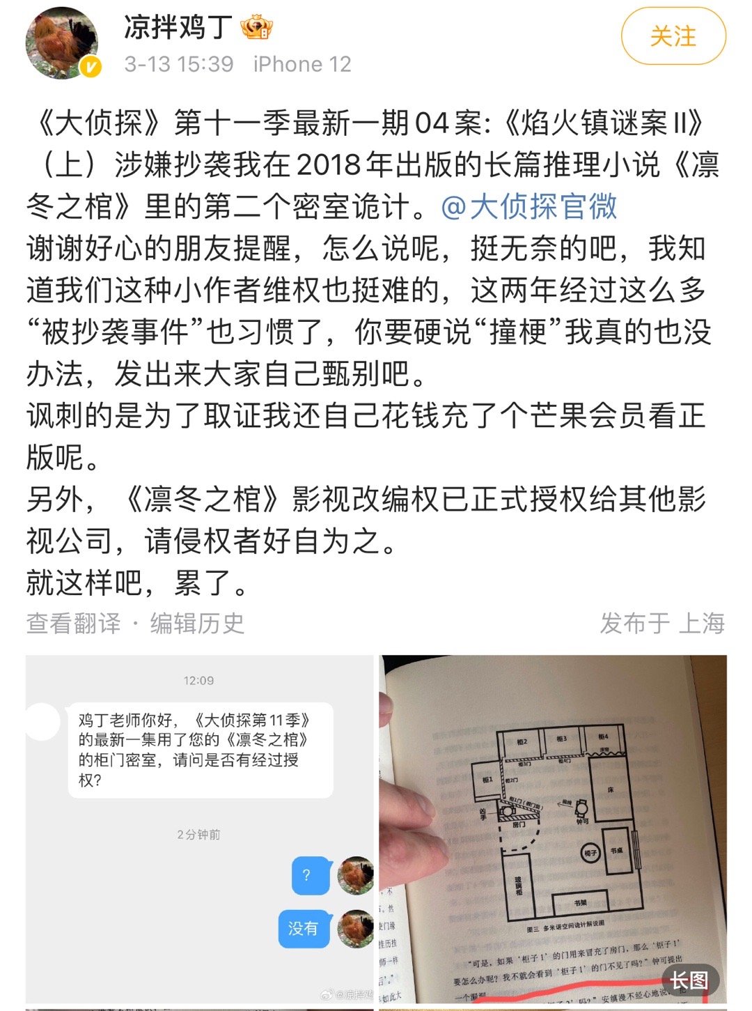 刚刷到推理作者凉拌鸡丁锤《大侦探》第11季最新一案抄袭的瓜。