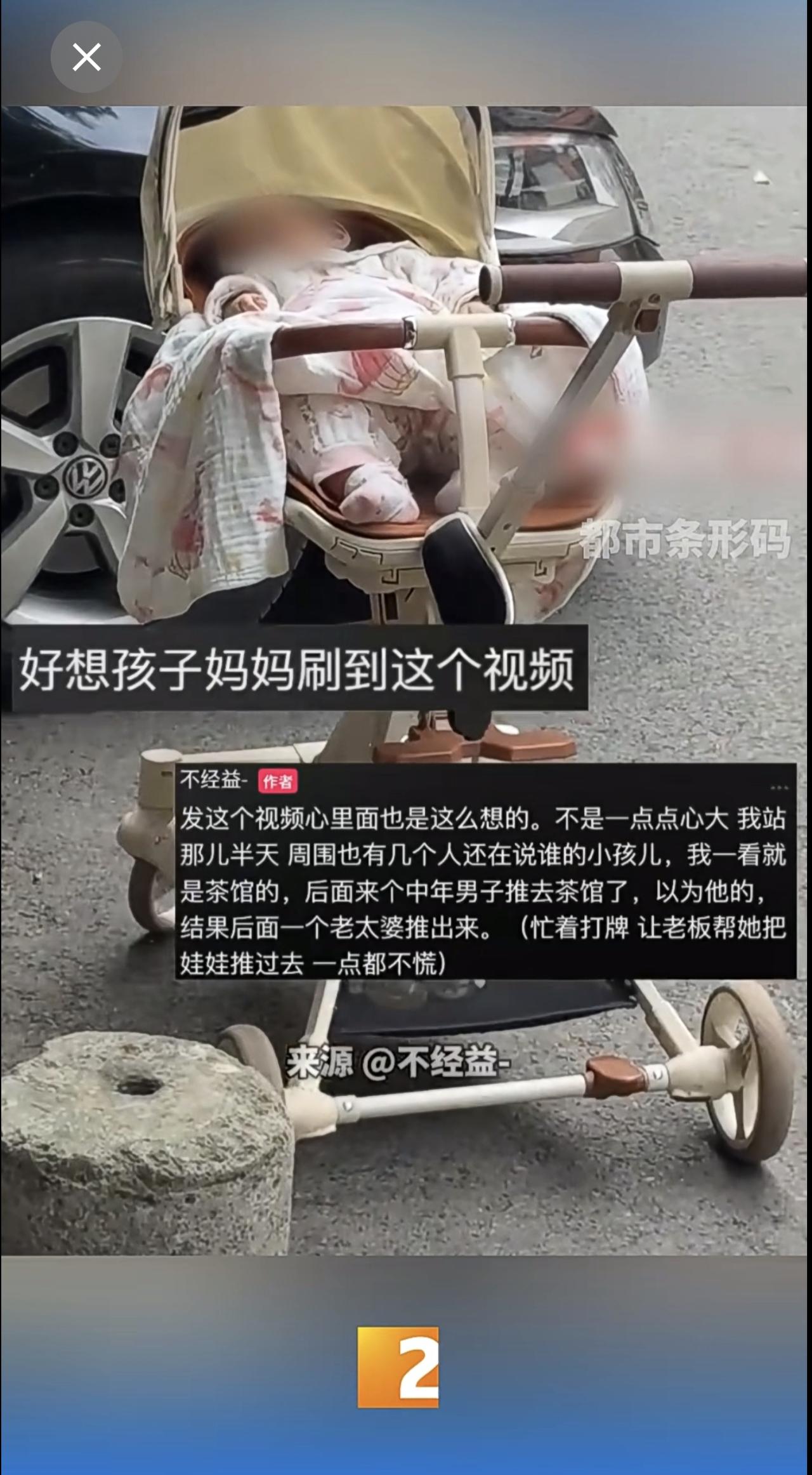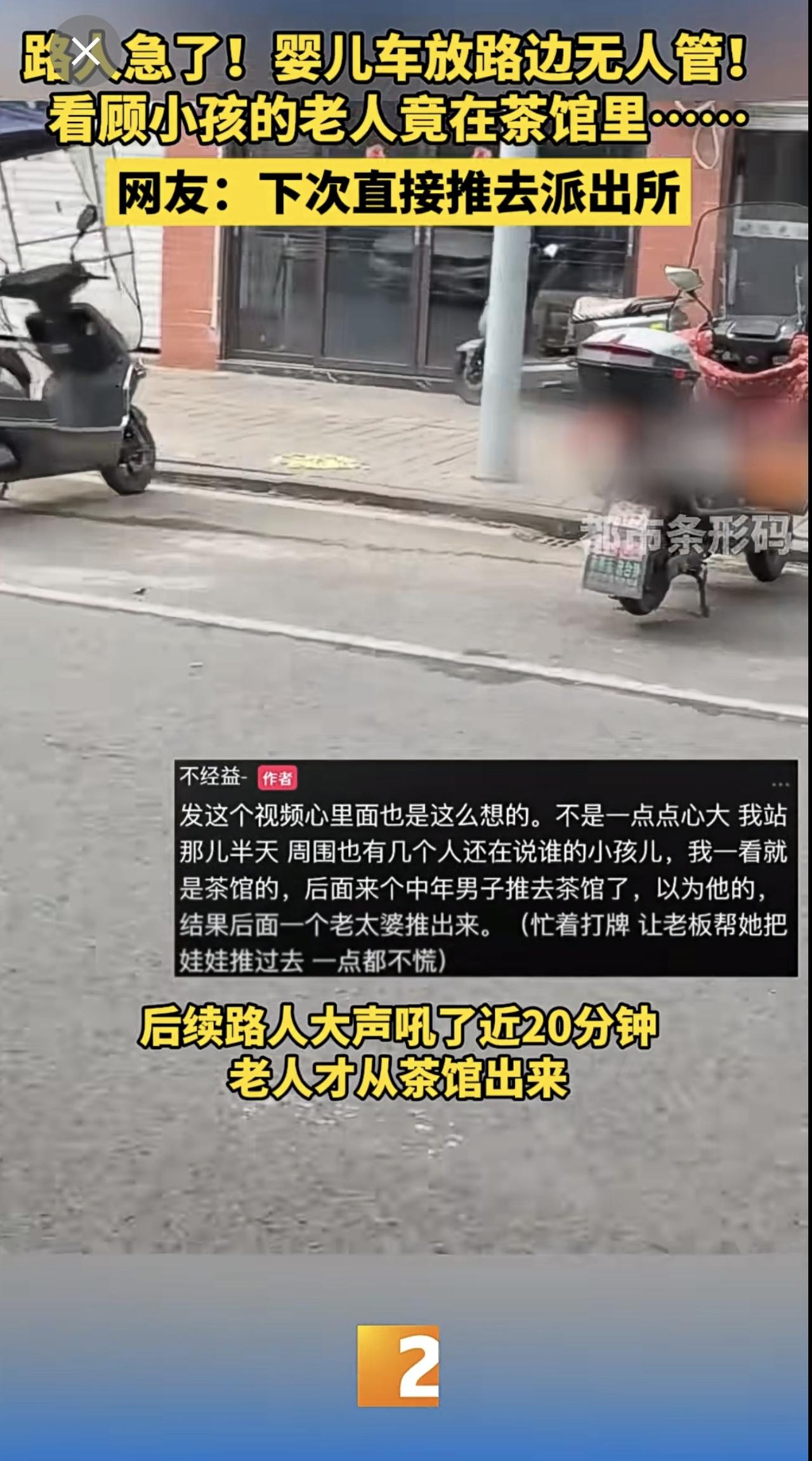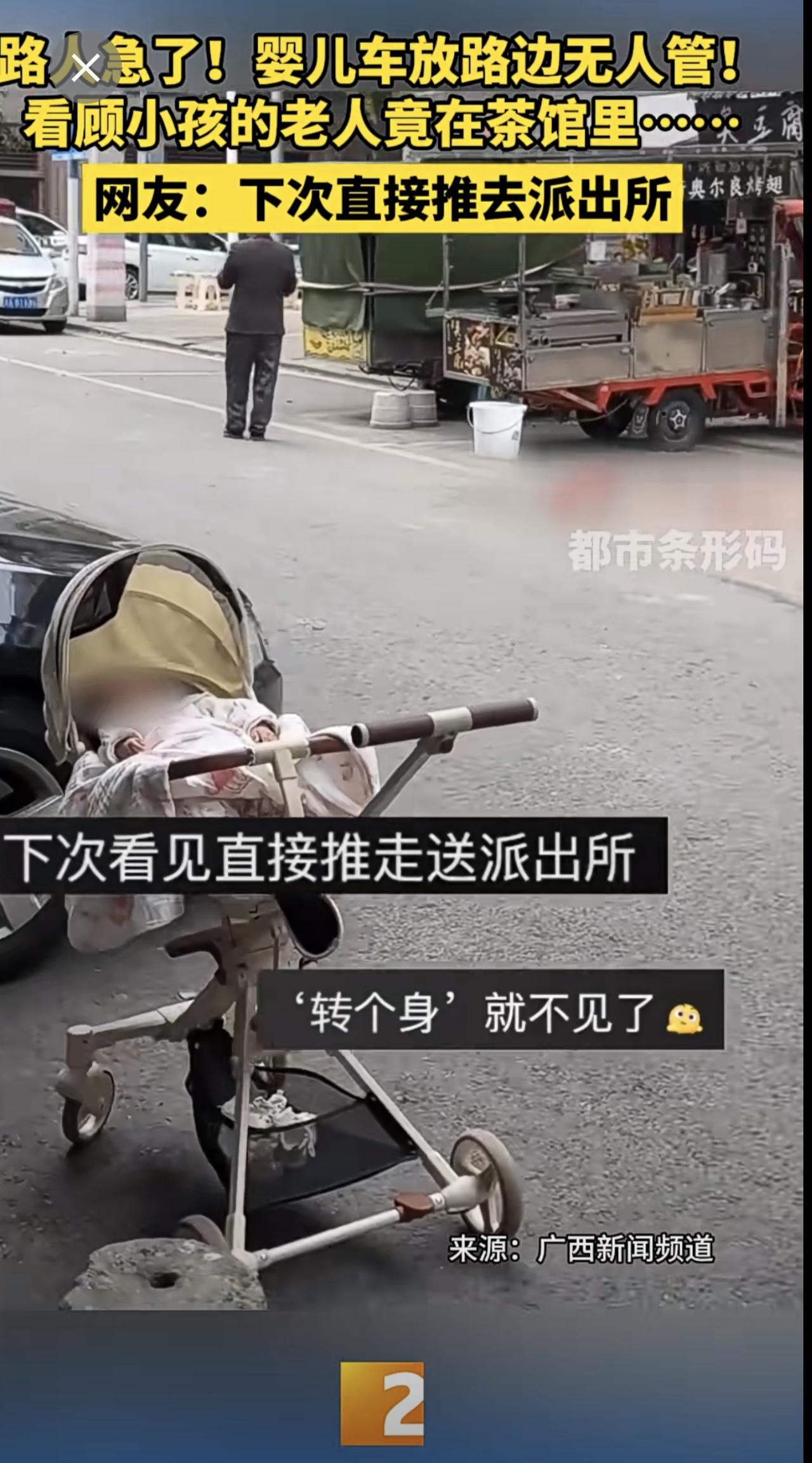 路人急了!婴儿车放路边无人管! 看顾小孩的老人竟在茶馆里…… 网友:下次直接推去派出所 婴儿车 无人看管的小孩