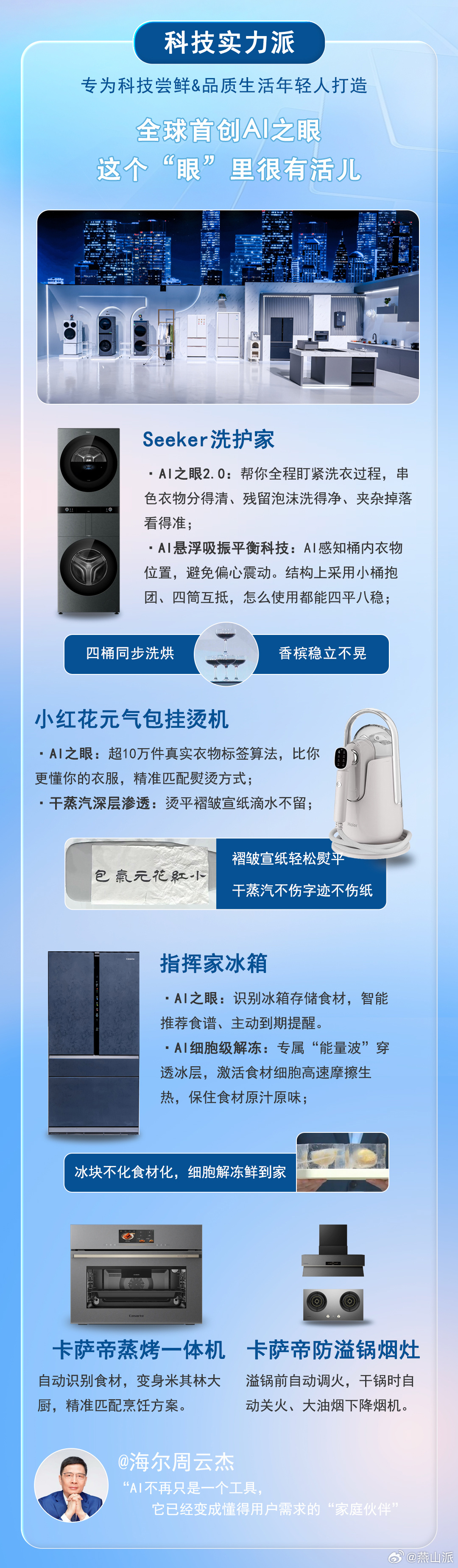 昨天看完央视新闻特别直播的「海尔2026 AI科技全场景发布会」,AI之眼2.0让我印象最深,可以说这个“眼”里真的很有活儿!这场发布会全程离不开“AI”俩字,海尔用AI几乎重置了家中所有的家用电器设备,可以说,这次海尔AI科技真的懂生活!显然,海尔没有把 AI 停留在概念层面,而是让这些硬核实力最终都落到了咱们生活的实处,让AI精准解决各类生活当中的小痛点,实实在在的提升了传统家电的使用体验。海尔发布会