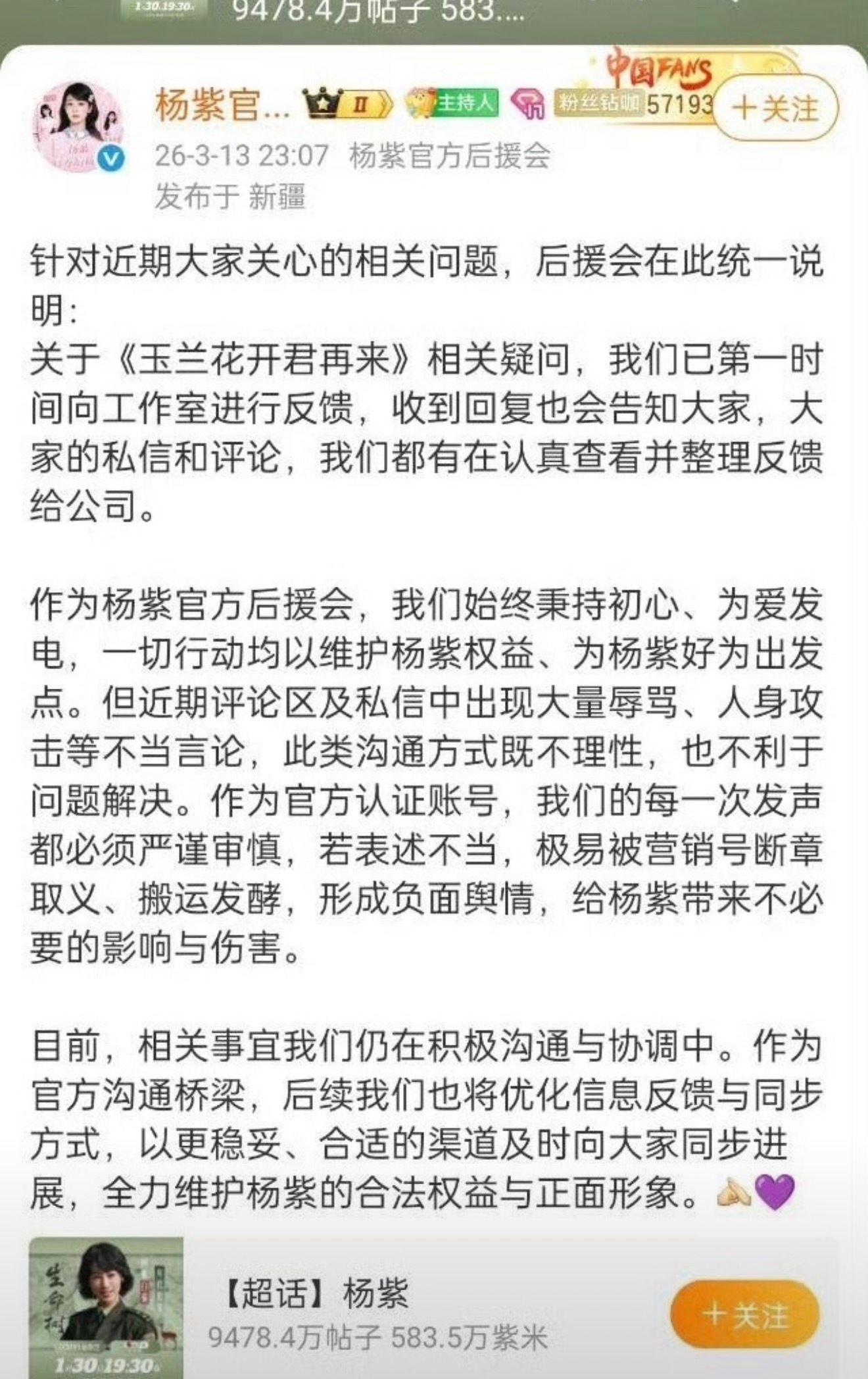 杨紫后援会发博了好像是回应粉丝冲导演玉兰花开君再来用上海方言那件事