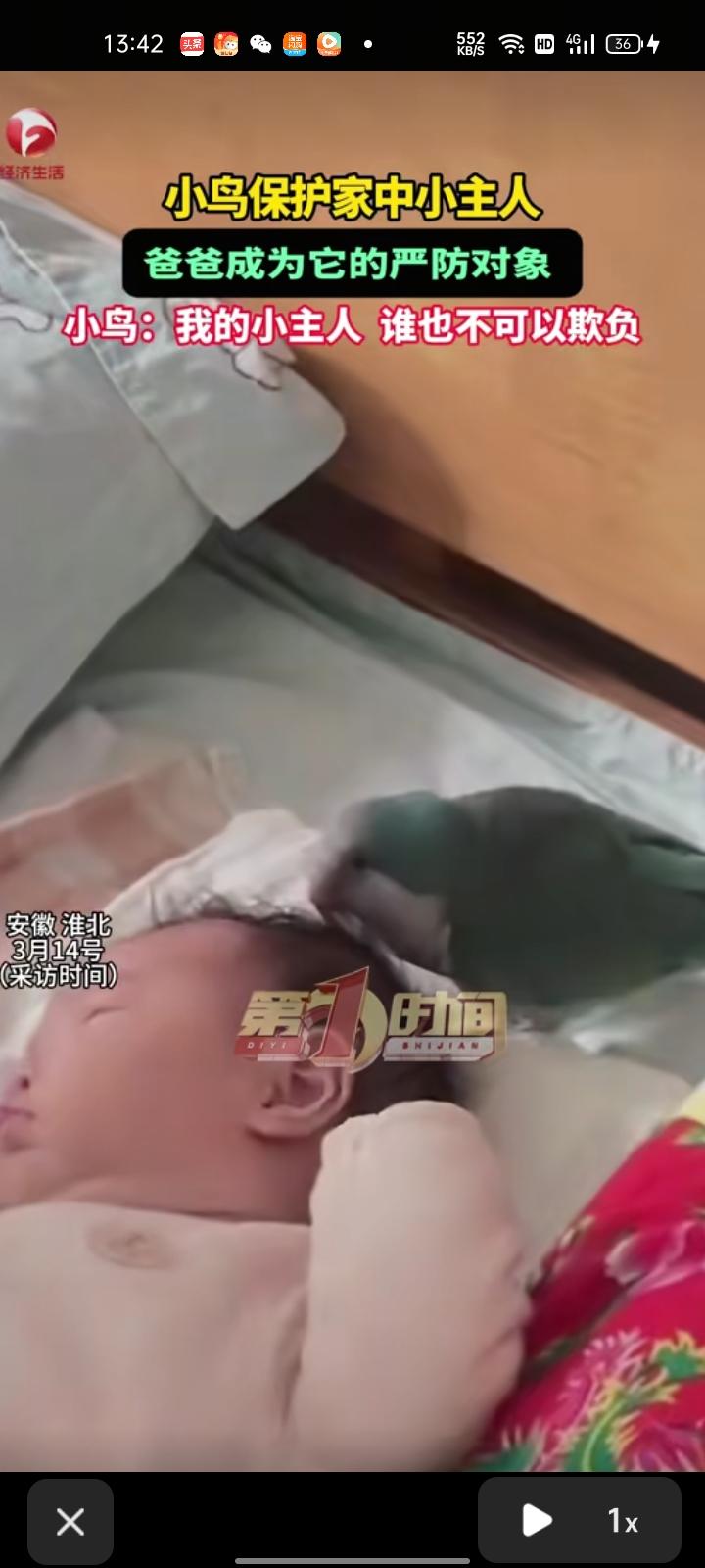 3月6日,安徽淮北。女子发视频表示,小鸟为保护宝宝,在孩子爸爸伸手去抱就去阻止,并表示“我的小主人谁都不可以欺负”。自家小鸟养了一年零八个月,这样护宝宝的行为已经有一个月了,平时打闹玩的时候,不管孩子爸爸打哥哥还是什么,小鸟都会护。