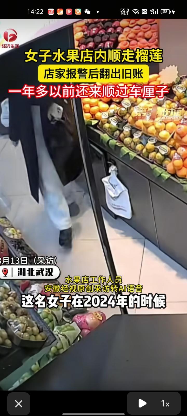 3月12日,湖北武汉。水果店工作人员称,该女子在2024年就“光顾”一次,趁店员不注意就拿一盒车厘子,谁料就在前天,她又来了。 只见女子拿了香蕉做掩护,之后榴莲藏到其他地方,再去柜台结香蕉的钱,走的时候就顺走了榴莲,查了监控才发现,目前已报警。 警方找到了这位涉事女子,后续回和女子谈赔偿。