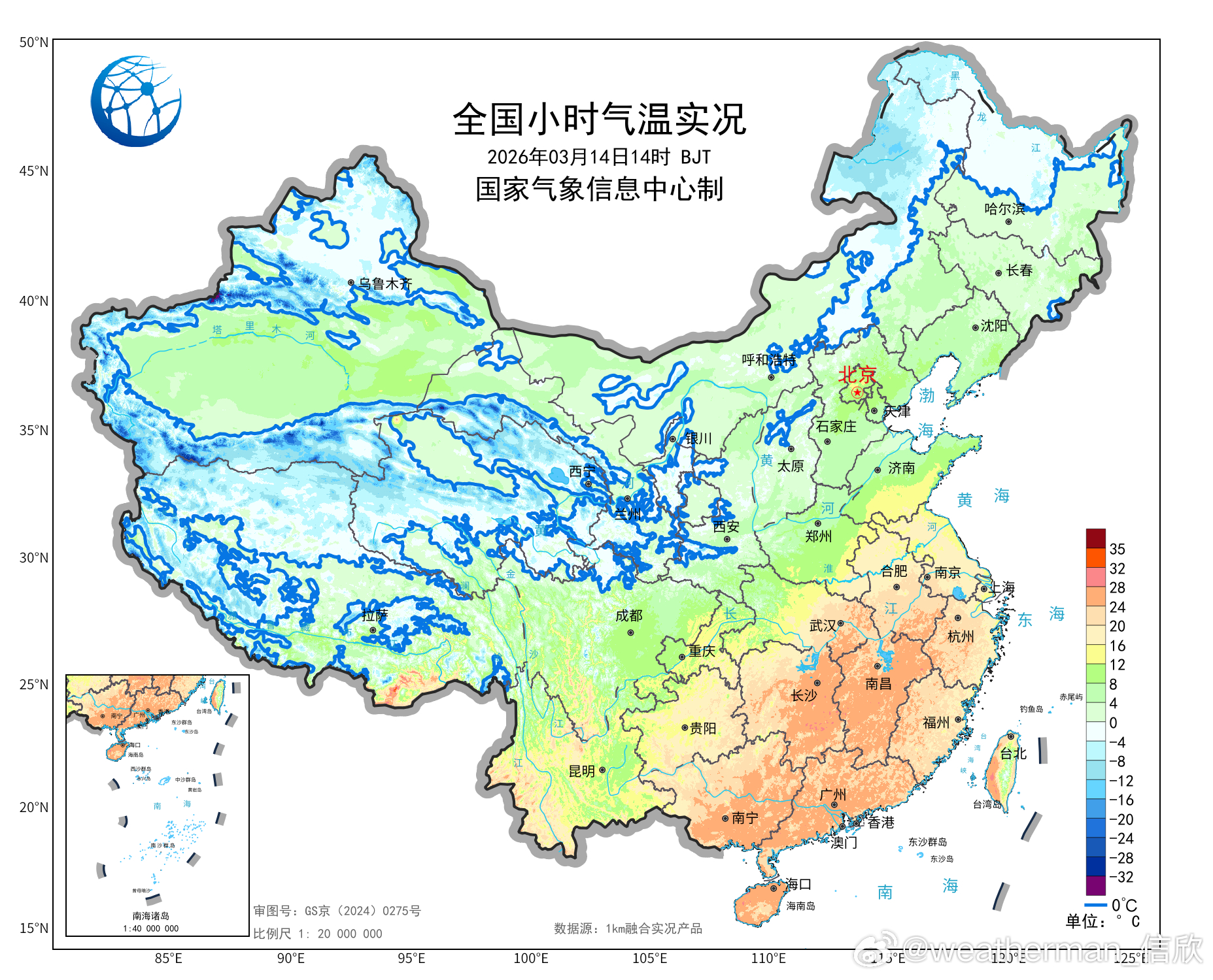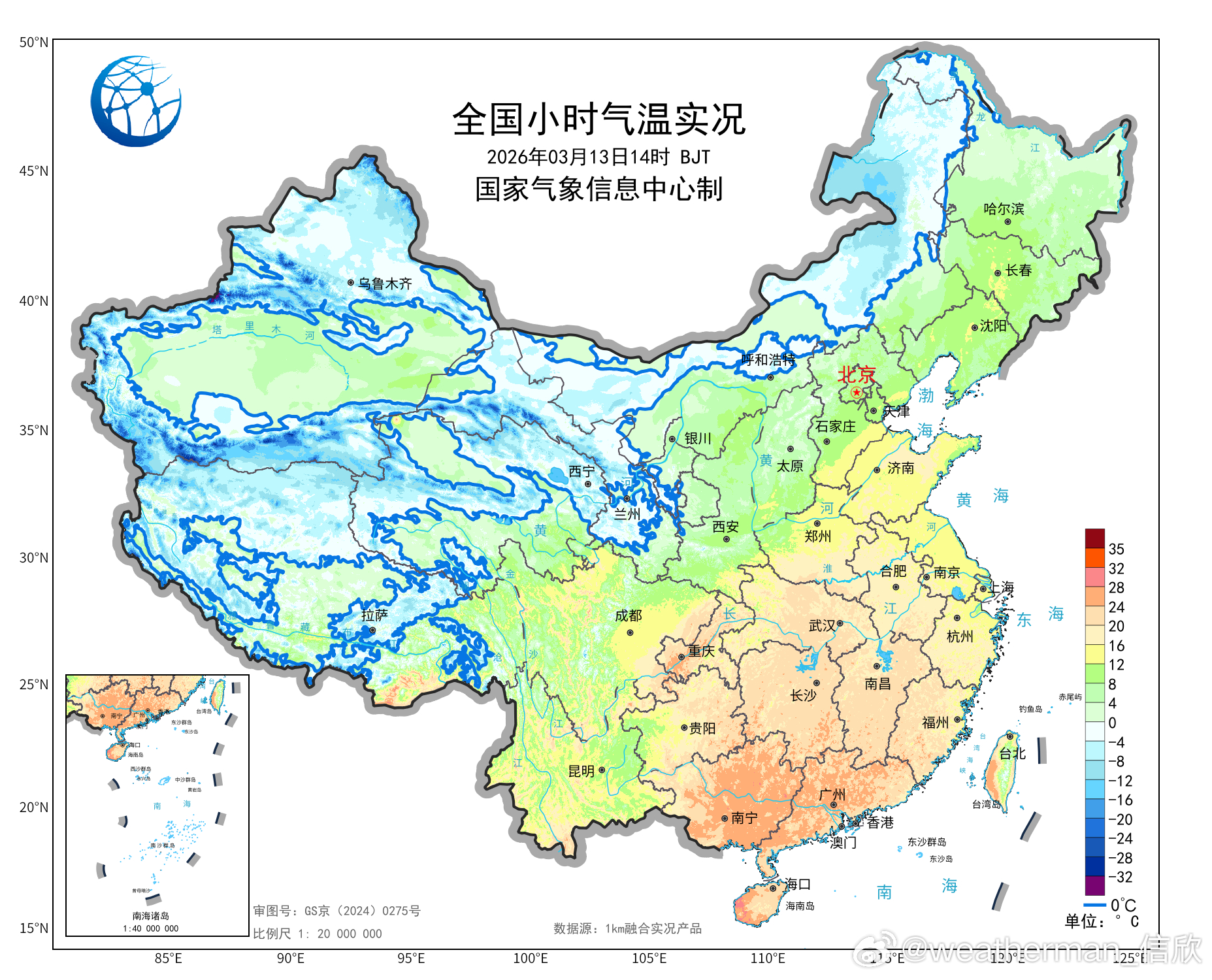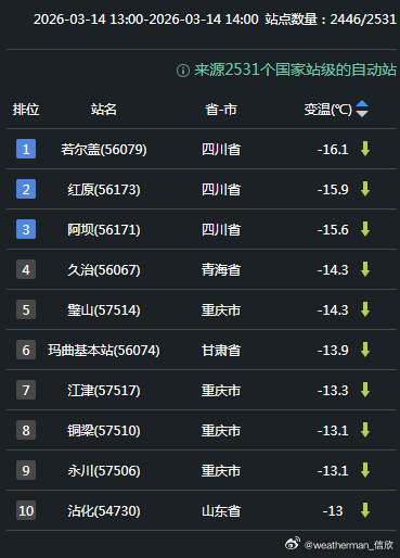 【气温波动】今天冷空气+降水的影响,导致才从青海四川到东北多地出现降温。其中青海甘肃四川三省交界、重庆西部、山东北部,形成了三个降温中心。四川若尔盖降16.1℃、青海久治降14.3℃、重庆璧山降14.3℃、甘肃玛曲降13.9℃、山东沾化降13℃,为各自省市14时降温最强站点。