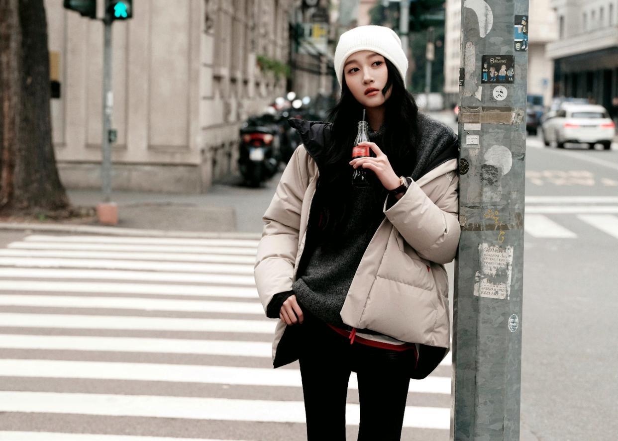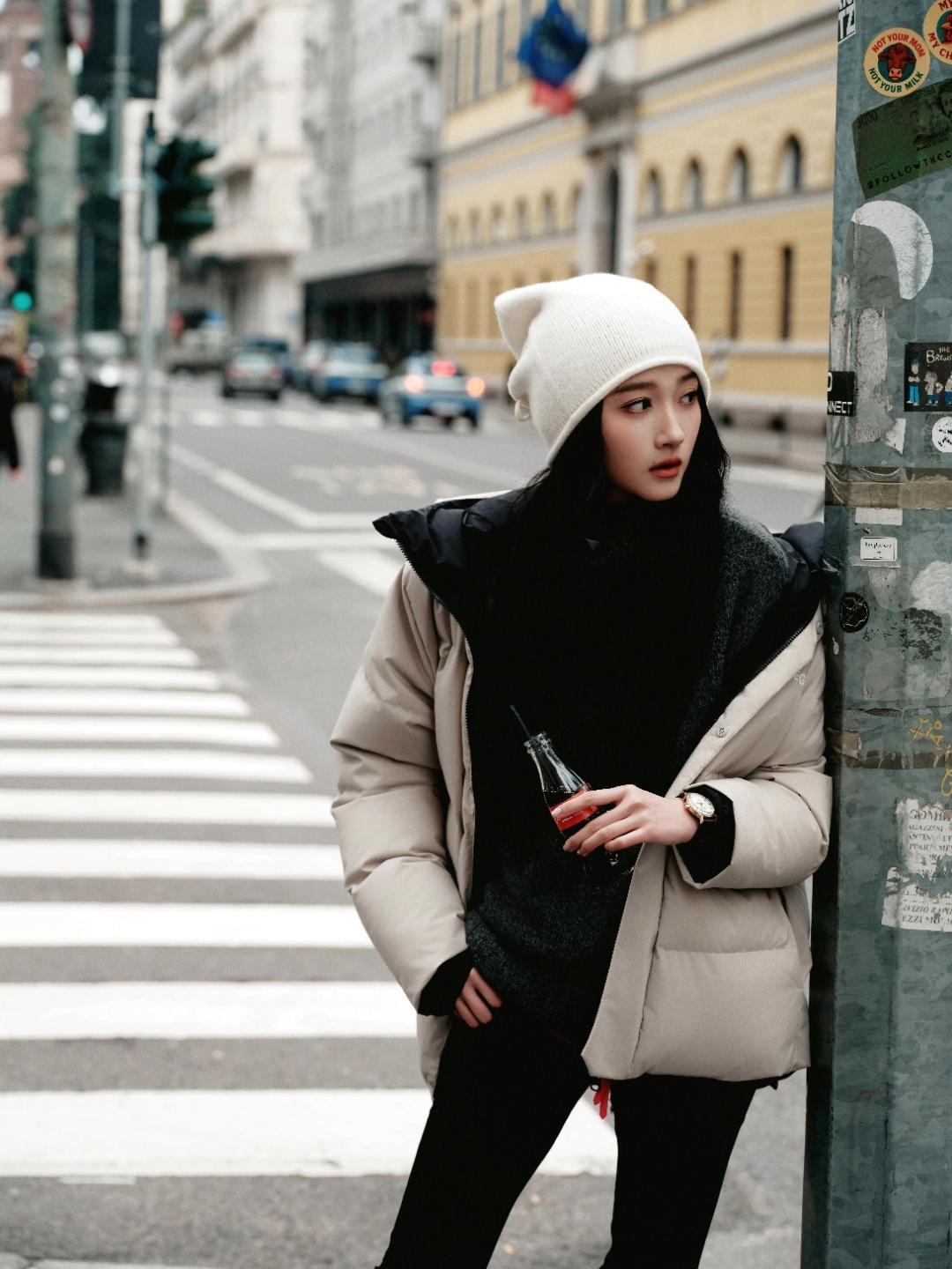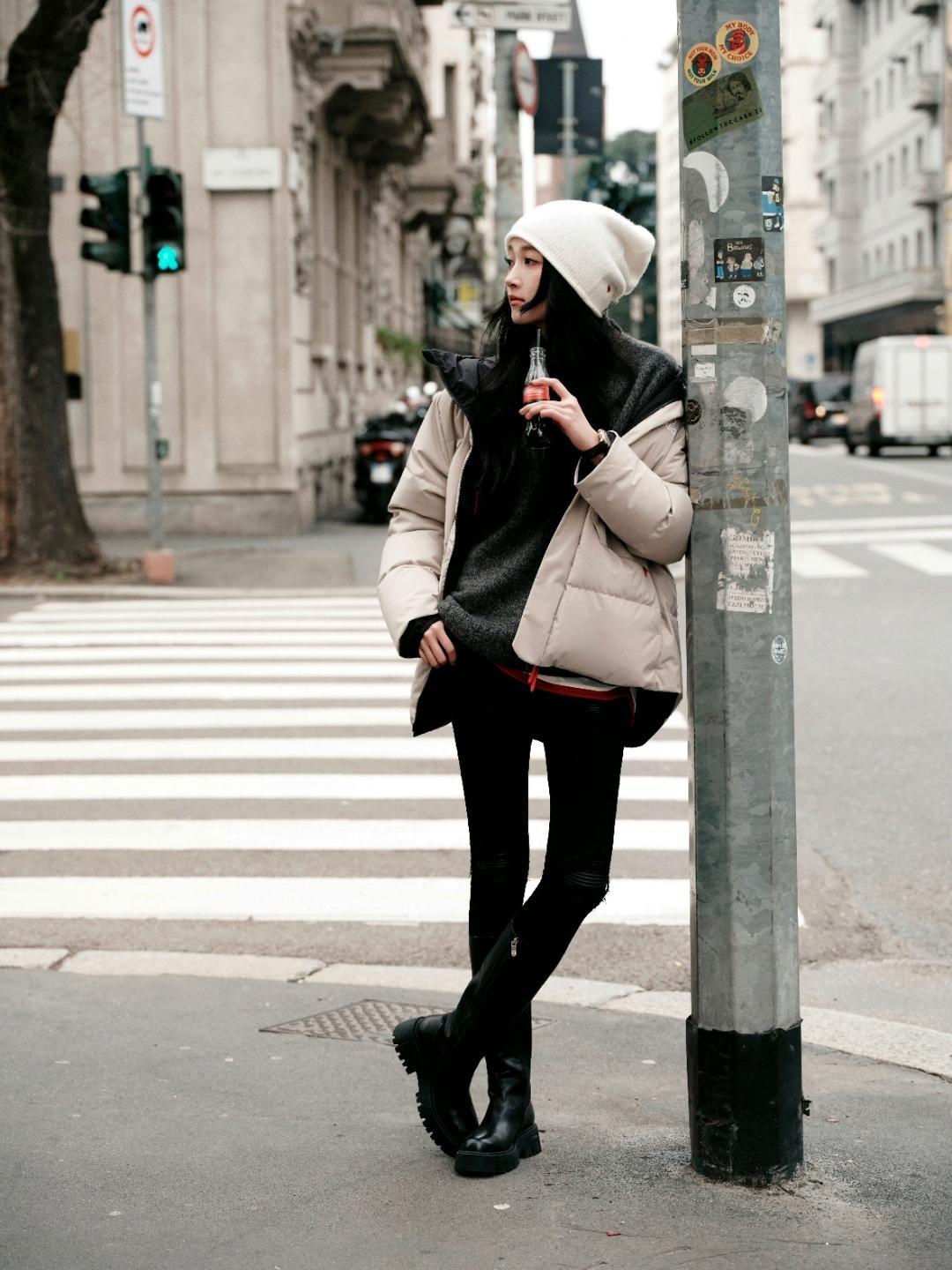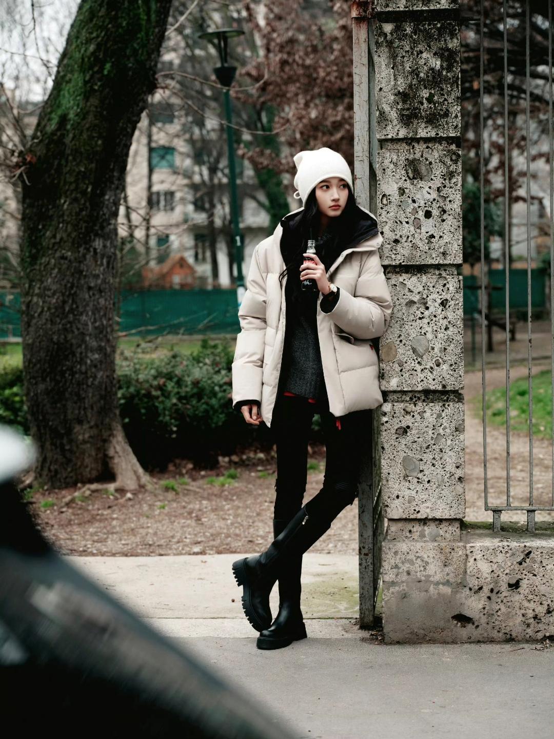当米兰的冷调街景遇上暖调穿搭,关晓彤这组街拍把“随性高级”的氛围感拉满了。 浅米色短款羽绒服搭配深灰高领毛衣,利落收腰与黑红撞色细节,在冬日里既保暖又不失层次感;白色针织帽与厚底马丁靴是点睛之笔,中和了羽绒服的厚重,多了几分少年感的利落。另一套长款白羽绒服则更显气场,极简剪裁衬出修长身形,在米兰老建筑的背景里,像从电影里走出的清冷少女。