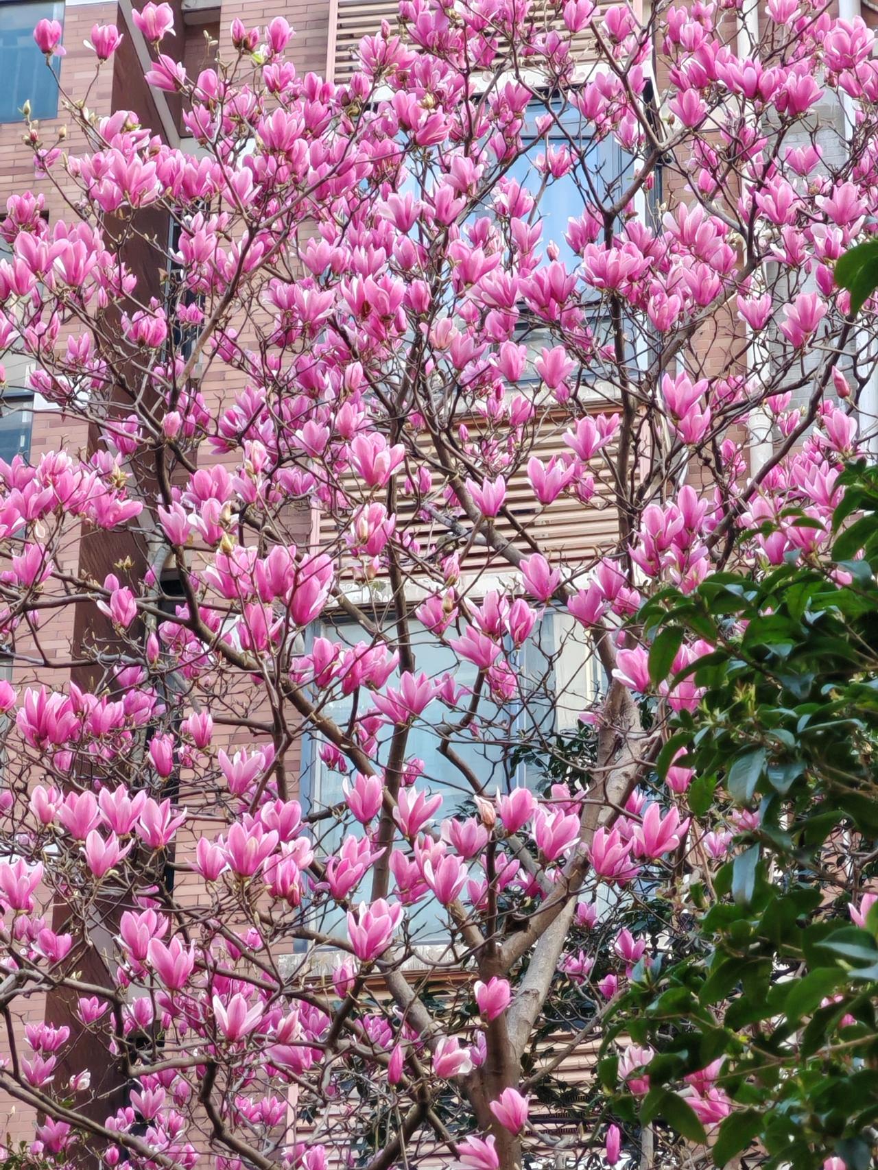 繁花似锦,色彩夺目 画面主体是玉兰树,满枝的花朵呈现出一种饱和度极高的粉紫调,仿佛打翻了的胭脂,热烈而饱满。花瓣层层叠叠,形态舒展,有的完全绽放,露出优雅的内里;有的则含苞待放,如尖锥般挺立,预示着更多的美即将释放。无数花朵密集地缀满枝头,形成一片浩瀚的花海,几乎将灰褐色的枝干完全淹没。这种色彩在阳光下显得格外鲜活,充满了春天的生命力。 枝干交错,生机盎然 深褐色的枝干在花海中纵横交错,虽然叶片尚未萌发,但光秃的枝条却因花朵的点缀而显得不再萧瑟,反而透出一种遒劲的骨架美。枝条向四周伸展,构成了一张自然的网,将背景中的建筑温柔地框入其中。在画面的右下角,一丛深绿色的阔叶植物悄然探入,其深沉的绿色与玉兰花的粉紫形成了鲜明的冷暖对比,为画面增添了一抹沉静的底色,也丰富了视觉层次。 背景衬托,虚实相生 背景是一栋红砖外墙的现代建筑,清晰的窗框和墙面纹理构成了几何线条的背景板。建筑的红色砖墙与玉兰花的粉紫在色调上和谐统一,而玻璃窗反射出的冷蓝色调则与暖色花朵形成微妙的反差。这种城市元素的介入,非但没有破坏画面的自然美感,反而赋予了这幅春景一种“闹中取静”的都市诗意——在钢筋水泥的丛林里,依然有如此热烈的生命在肆意生长。