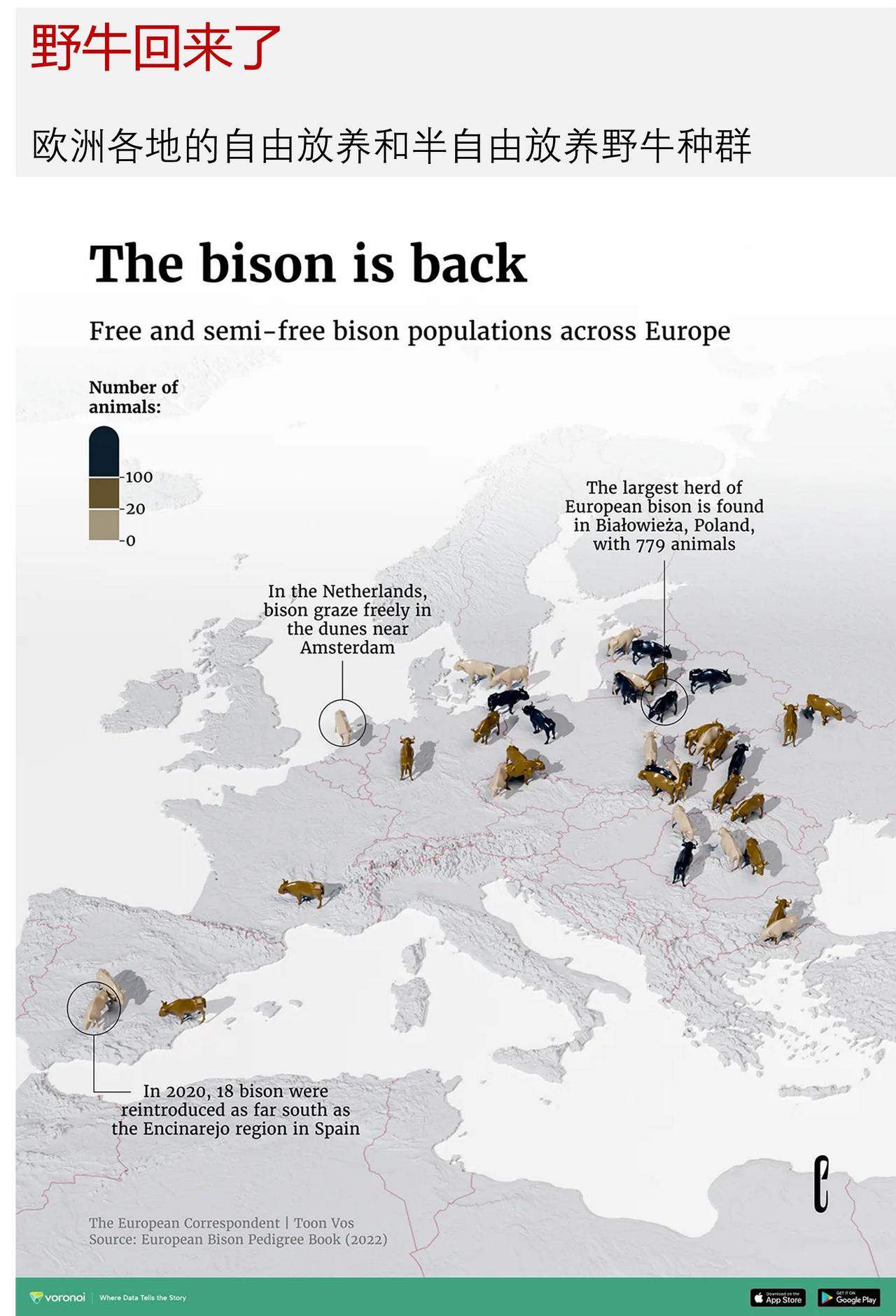 濒临灭绝的物种正在恢复生机,欧洲野牛回来了 曾经在欧洲广泛分布的欧洲野由于数百年来的捕猎和栖息地的丧失,几乎完全灭绝。到 20 世纪初,该物种在野外已完全消失。 然而如今,环保人士却目睹了这一令人瞩目的复苏景象。借助比亚洛维斯基国家公园提供的最新数据,并通过《欧洲通讯员》的可视化处理,下面这张地图展示了如今自由放养和半自由放养的野牛种群在欧洲各地的活动范围。 ——欧洲:重返大自然的野牛家园 东欧地区在地图上占据了显著的位置,波兰、白俄罗斯以及周边国家拥有数量最多的牛群。其中最大的一群生活在波兰的比亚沃伊扎森林,约有 779 头,这里成为了该物种最为重要的栖息地之一。 ——欧洲原生野牛何以消失? 欧洲野牛曾经在欧洲大陆几乎所有的森林和草原地带自由漫步。然而,数百年来的大规模森林砍伐、农业扩张以及捕猎行为,使它们的活动范围大幅缩小。 到 1927 年,最后一只野生的欧洲野牛已被捕杀。该物种仅存于动物园和私人保护区中,留给环保人士的只是少量个体来重新恢复其种群数量。 所有现代欧洲野牛都是由一个规模较小的圈养群体繁衍而来,这个群体最初仅有约十几头个体。这一瓶颈现象导致了基因方面的难题,而如今的保护人员仍在努力解决这些问题。 ——使欧洲野牛得以复生的保护行动 该物种得以存活,很大程度上要归功于各国协同开展的保护工作。20 世纪 20 年代,就开始了圈养繁殖计划,随后动物们逐渐被放归到受保护的区域。 像“欧洲野化运动”这样的组织此后已在多个地区帮助恢复了野牛群,从喀尔巴阡山脉到西欧的部分地区都有所涉及。重新引入通常发生在人类活动干扰较少的大型森林生态系统中。 在野牛恢复工作中发挥引领作用的国家包括: --波兰:拥有最多数量以及历史悠久的比亚沃维耶扎森林牛群的所在之地 --罗马尼亚:在南喀尔巴阡山脉推进野生动物回归计划 --白俄罗斯:拥有多个规模较大且稳定的种群 ---德国和荷兰:规模较小但具有重要象征意义的重新引入行动 这些项目通常会与保护区协同运作。事实上,欧洲在近几十年里大幅扩大了保护区的范围,像波兰这样的国家就拥有大量的保护区土地。 ——野牛未来还能向何处扩张? 尽管大部分野牛仍集中在东欧地区,但环保人士认为,该大陆实际能够承载的野牛数量要比目前的实际情况多得多。 广阔的野生动植物迁徙通道——尤其是在喀尔巴阡山脉、巴尔干半岛以及斯堪的纳维亚半岛的部分地区——为物种的繁衍提供了适宜的栖息地。就连西欧也在尝试开展规模较小的野生动物回归项目。 例如,如今野牛已在荷兰阿姆斯特丹附近的沿海沙丘上觅食,而西班牙在 2020 年也在恩塞纳雷斯地区重新引入了一小群野牛。 如果这些项目能够持续取得成功,那么欧洲野牛的故事将会成为欧洲大陆最引人注目的野生动物复苏案例之一,这也将证明,只要通过持续的保护措施,濒临灭绝的物种是能够恢复生机的。