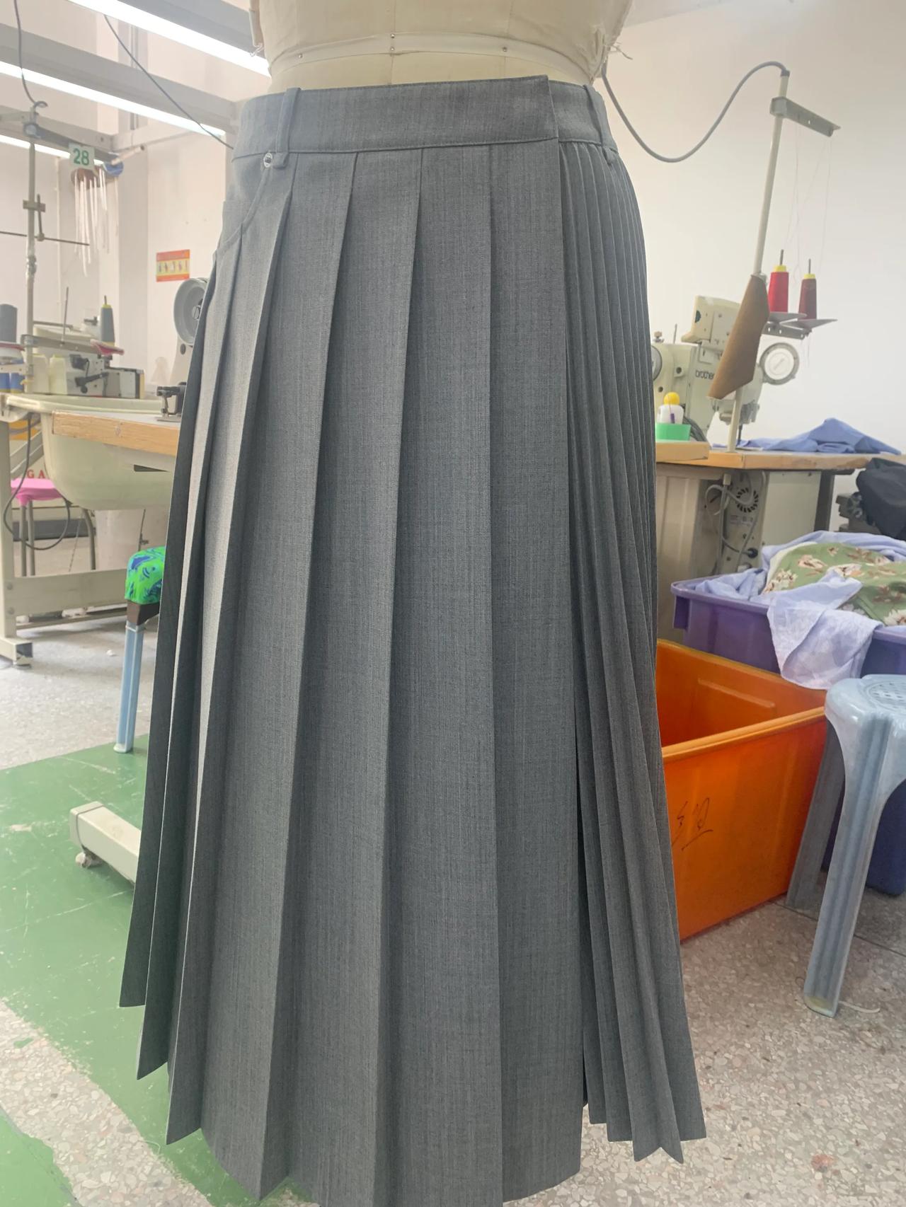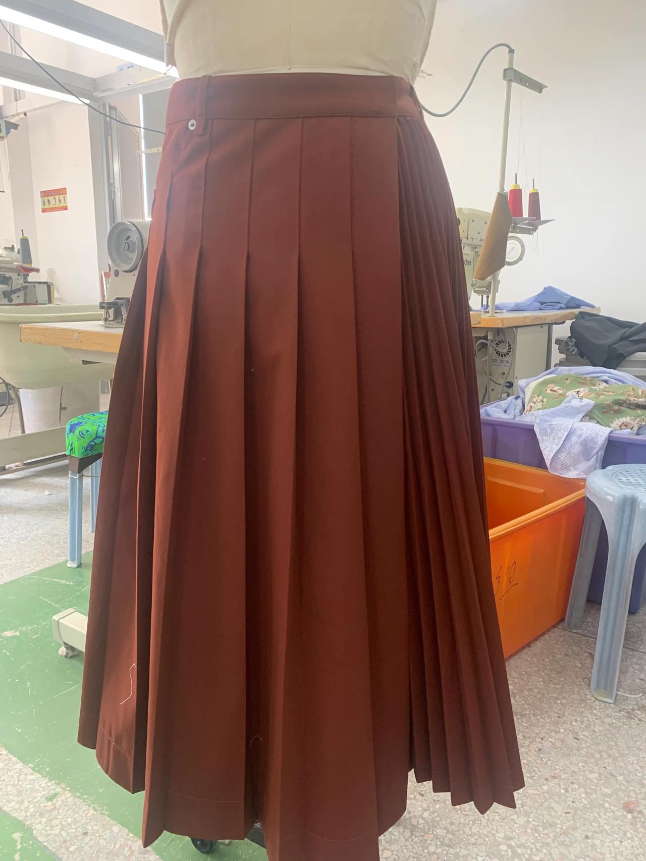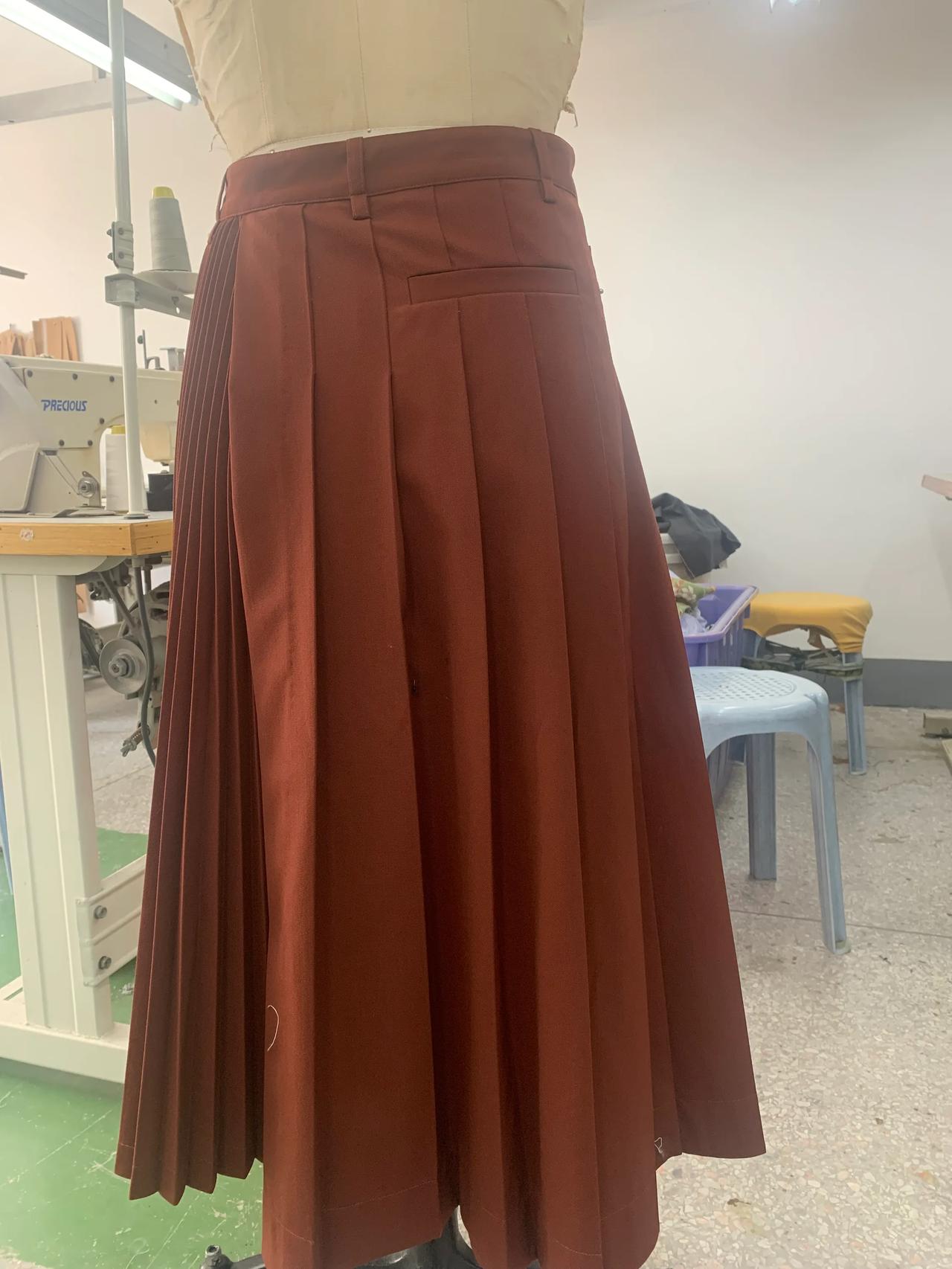 经过多次沟通和改版,这条裙子终于正常一点了。 这就是我们周末加班赶制的批版。因为客户想要在百折裙上加后袋,做出来穿在模特上效果不好,经过多次沟通和改版,现在看起来好看多了。 虽然这条裙子看起来普通,做起来挺麻烦的。裙子上的百褶要去专业的厂家压褶,在车缝的过程中,技术要求也很高,不能起褶变形,还要保证小的束褶是直立的状态。 正所谓外行看热闹,内行看门道。无论什么产品,保护原创很有必要,因为原创投入了大量人力和精力,成本很高。