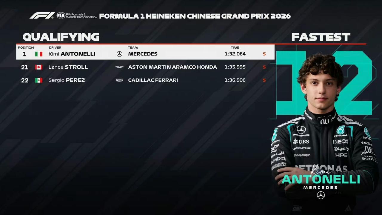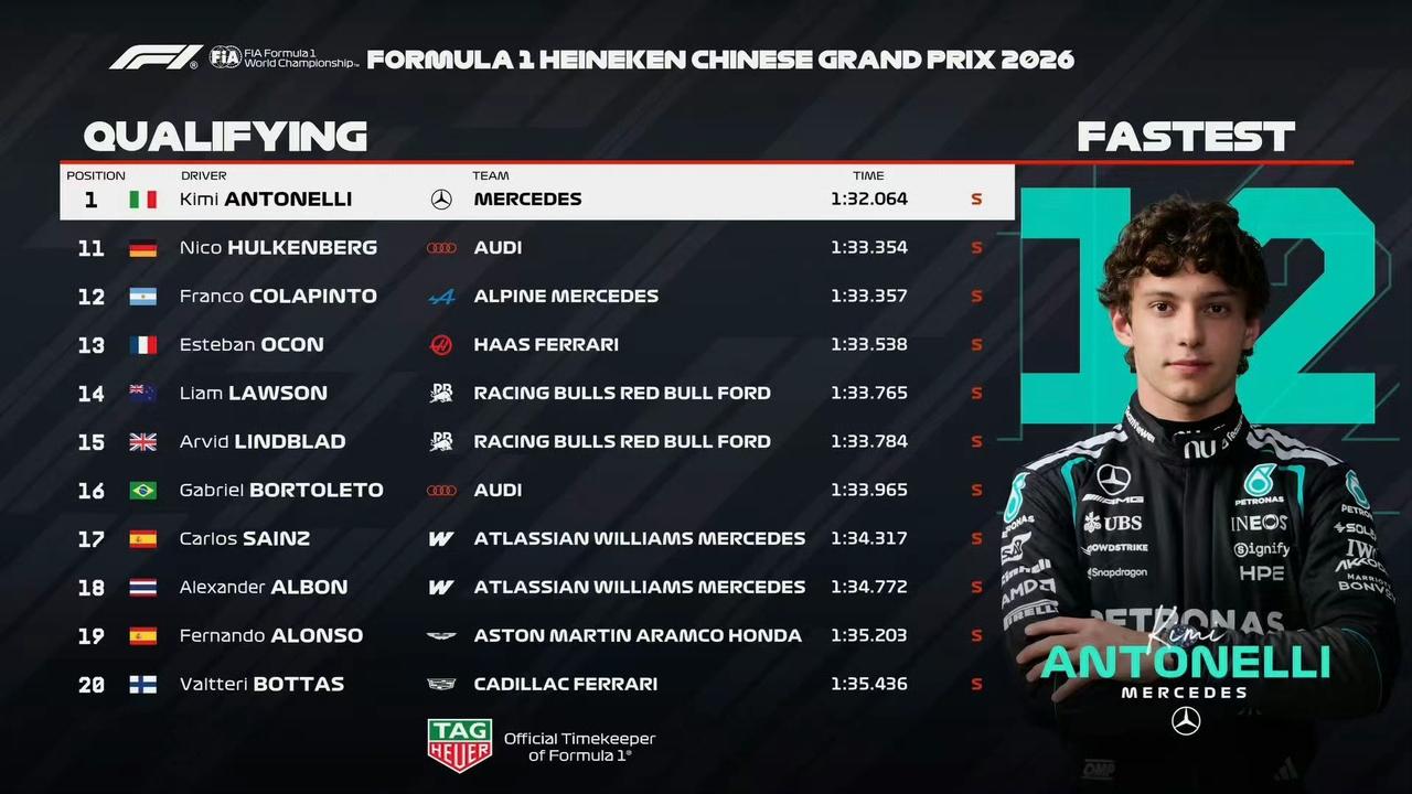 F1中国大奖赛排位赛结束。安东内利以1:32.064成绩拿下杆位,成为F1历史上最年轻的杆位得主。 拉塞尔第二,法拉利双雄分列三四,维斯塔潘第八,马丁、凯迪拉克垫底。 Q2结束:被淘汰的车手:霍肯伯格,科拉平托,奥康,劳森,林德布拉德,博托莱托。 Q1结束:淘汰区车手:塞恩斯,阿尔本,阿隆索,博塔斯,斯托尔,佩雷兹。