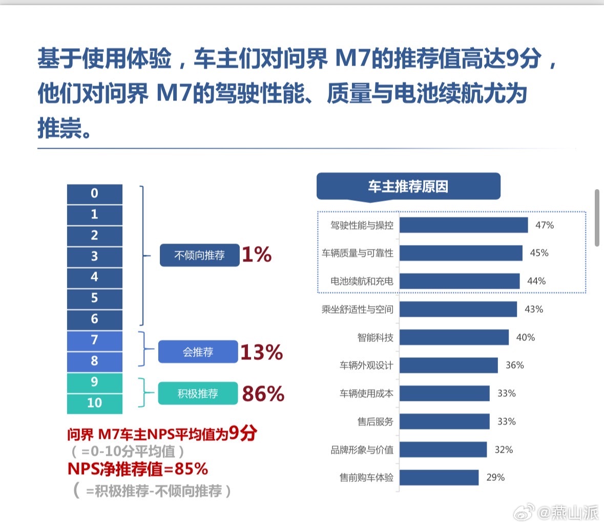 AWE华为全场景智慧生活 尼尔森最新《问界M7车主画像分析报告》出炉,车主画像一目了然:年轻高知、高收入、重家庭、追科技,妥妥精英家庭首选。选车先看安全与智驾,问界M7把硬核实力落到实处。全向防碰撞系统+华为乾崑智驾ADS 4.0,智能护驾更省心,安全感拉满。口碑直接封神,NPS净推荐值85%,近9成车主愿意主动推荐,真实口碑胜过一切说辞。累计交付突破43万台,30万级国民SUV实至名归,用实力与口碑,站稳价值标杆。尼尔森报告称问界M7净推荐值达85% 近9成车主愿意主动推荐问界M7需要我再给你一版更简短、适合微博直发的精简版吗?