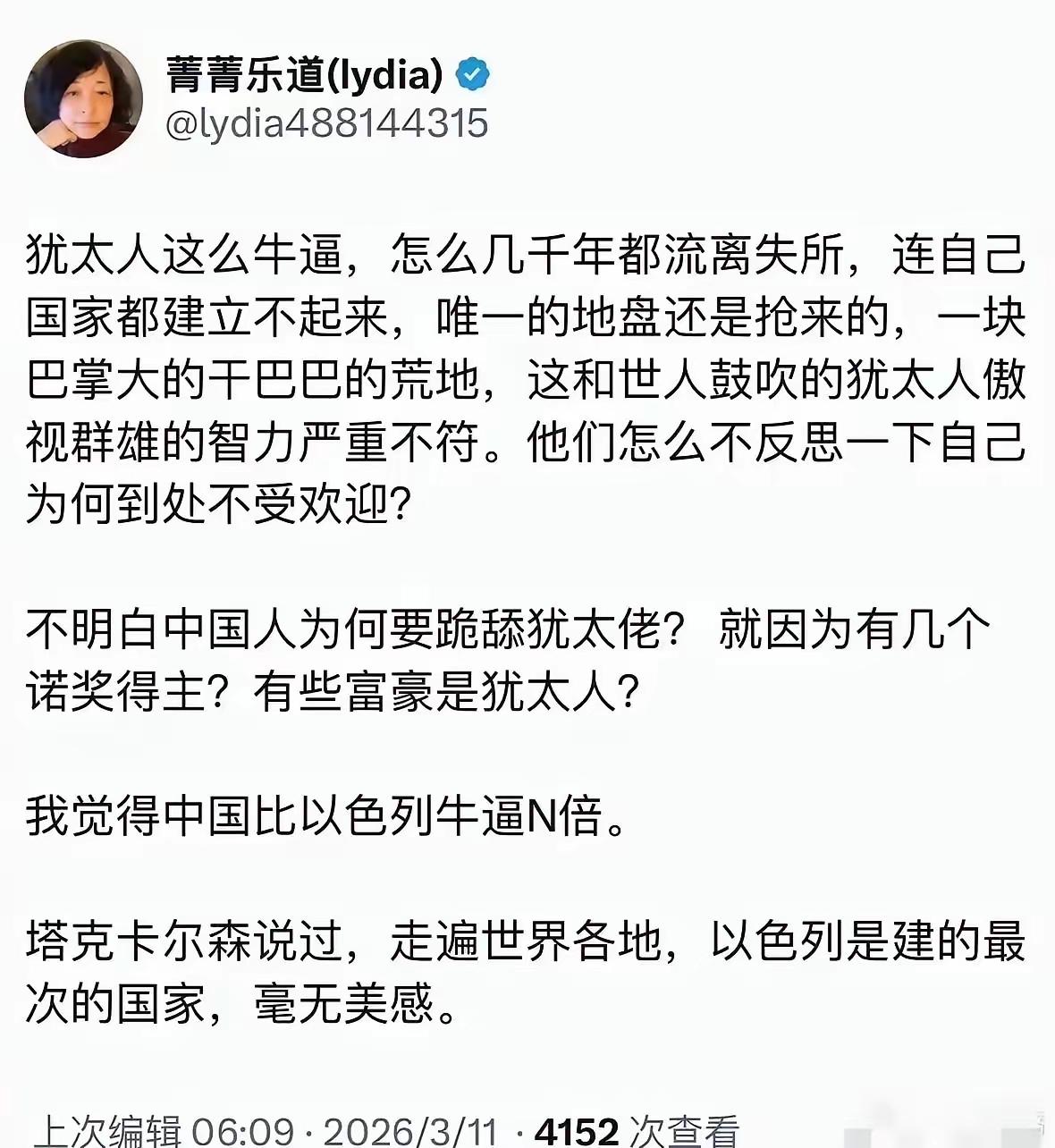 平视破局:当“神坛”与“魔盒”都被打碎 犹太人政策研究所点名批评了中国网络大V卢克文,认为卢克文属于反犹分子。但是卢克文不接受这个指控,他认为他并不是反犹,而是对犹太人祛魅,说白了就是平视犹太人。既不把他们当做高人一等的圣人崇拜,也不把他们当成全民族坏人来反对。而对于犹太人来说,不高看他们一等就是不行,就是反犹分子。 这种把平视直接等同于反犹的逻辑,本身就站不住脚。长久以来,中文互联网上对犹太人的认知一直处在两个极端,要么是被包装成天生聪慧、擅长经商、坚韧不拔的完美民族,被捧上神坛盲目崇拜,要么是被贴上阴谋论标签,当成操控世界的幕后黑手塞进恶意的魔盒。这两种看法都脱离了客观现实,把一个完整的民族简化成非黑即白的符号,既看不到犹太民族在历史上遭遇的苦难与坚守,也看不清其背后的群体差异与现实行为。卢克文所说的祛魅,就是要打碎这两种极端叙事,用平常心去看待一个普通民族,不戴滤镜,也不戴有色眼镜,这是理性讨论的基本前提,和反犹没有任何关系。 犹太人政策研究所的这份指责,本质上是在维护一种特权化的叙事霸权。他们习惯了外界对犹太民族保持特殊的敬畏与追捧,容不得任何客观的审视与评价,更容不得有人打破刻意营造的光环。这种做法把反犹主义的定义无限扩大,把正常的民族平视、政策批评、观点讨论全都打包进反犹的筐里,本质上是用道德绑架堵住别人的嘴。真正的反犹主义,是基于种族偏见的仇恨、歧视与迫害,是对一个民族全体成员的恶意攻击,而不是不搞特殊化的平等看待,更不是对具体事件与行为的客观点评。 把平视等同于反犹,还混淆了民族、宗教、国家政策三个完全不同的概念。犹太民族是一个族群,犹太教是一种宗教,以色列的国家政策是具体的政治行为,这三者不能混为一谈。批评以色列的某些政策,不等于反对犹太民族;指出犹太群体中存在的问题,不等于仇视所有犹太人。这种刻意的混淆,只会制造对立,破坏正常的交流与理解。中国和犹太民族没有历史恩怨,二战时期中国还曾接纳犹太难民,民间本就没有反犹的土壤,强行给普通网民扣上反犹的帽子,只会让人觉得荒谬又刻意。 这种双标逻辑也暴露了舆论霸权的虚弱。过去很长一段时间,西方舆论场牢牢掌控着对犹太民族叙事的定义权,谁不顺着他们的话说,谁就是政治不正确。现在越来越多的人开始独立思考,不再被单一叙事牵着走,愿意用平视的眼光看待不同民族与文化,这是认知的进步,也是打破舆论垄断的体现。那些习惯了高高在上的群体,面对这种平视会感到不适,于是就用扣帽子的方式试图维持特权,可这样的做法只会让更多人看清真相,反而加速了神坛与魔盒的破碎。 平视从来不是冒犯,而是最真诚的尊重。每个民族都有自己的历史、文化与优缺点,没有哪个民族天生高人一等,也没有哪个民族该被全盘否定。理性看待不同族群,不神化、不妖魔化,不搞特殊对待,不搞恶意攻击,才是文明社会应有的态度。用反犹的标签打压平视,只会让自己陷入孤立,也会让更多人看清这种叙事的虚伪。 各位读者你们怎么看?欢迎在评论区讨论。犹太全球主义 卢克文采访 卢克文账号被封 中西正义观对比 崇州卢克文 卢克主 西式舆论