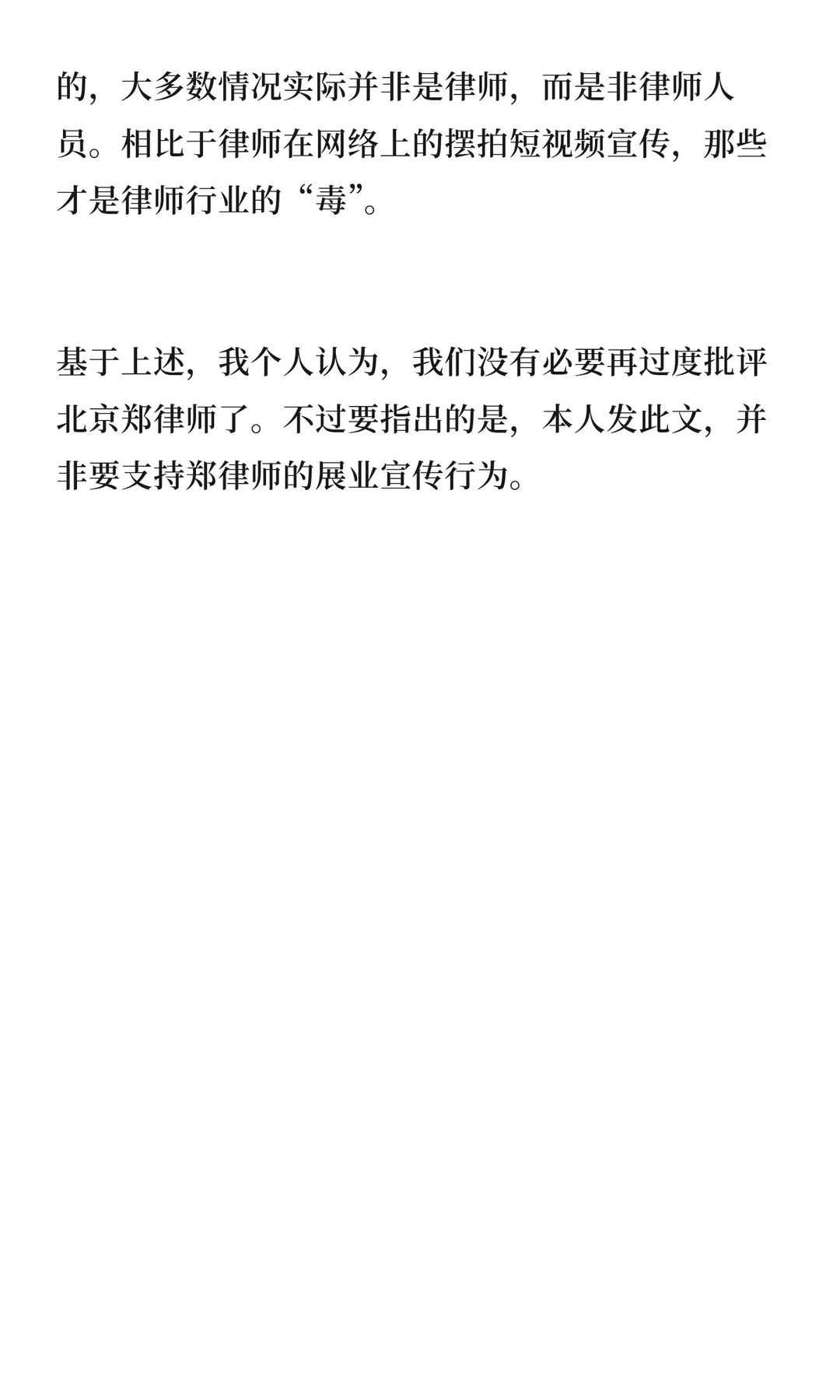 基于上述,我个人认为,我们没有必要再过度批评北京郑律师了。不过要指出的是,本人发此文,并非要支持郑律师的展业宣传行为。