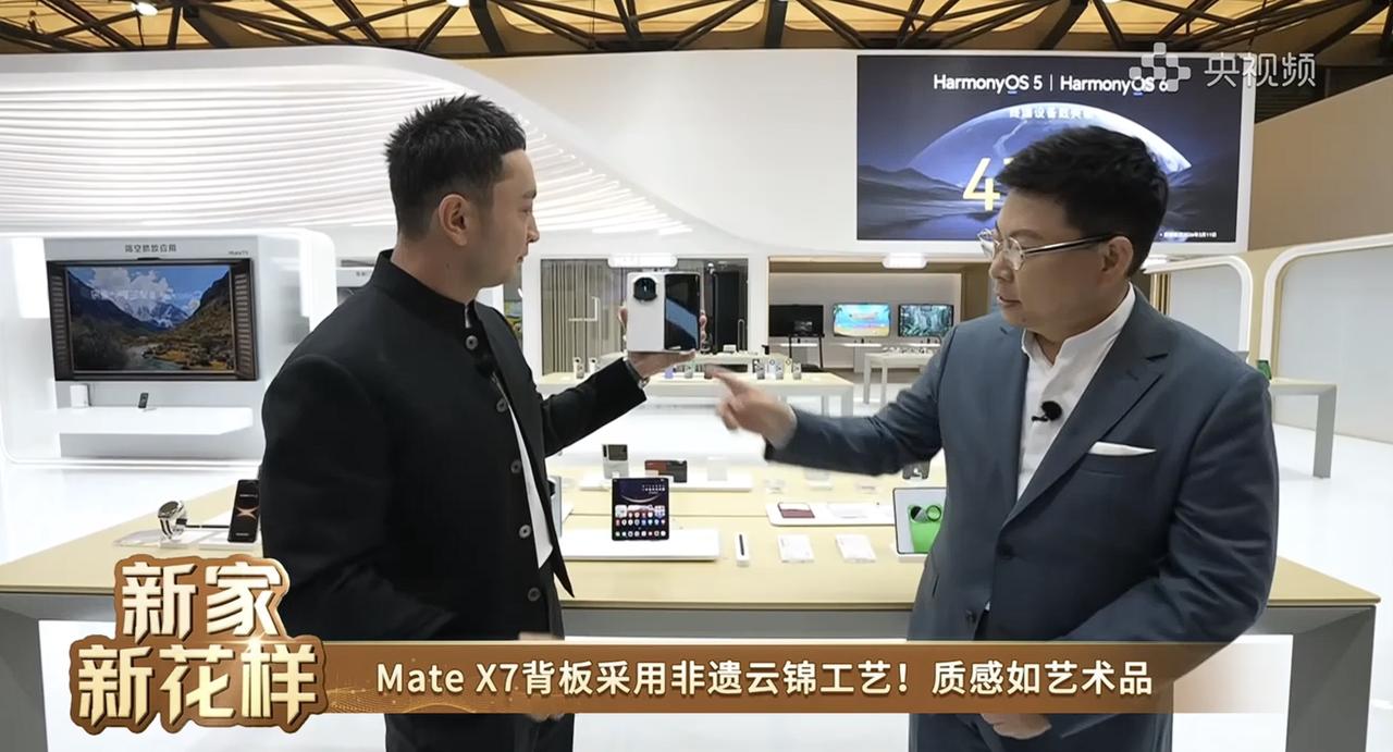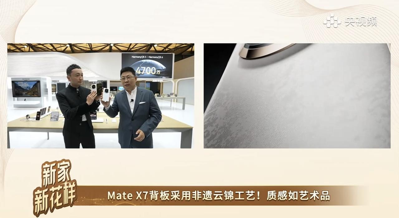 上海AWE展会现场,余承东再次携手知名主持人尼格买提开启直播,聚焦华为折叠屏技术。直播中,余承东向观众展示了华为最新款双折叠旗舰——华为Mate X7。 华为Mate X7的外观设计全面焕新,采用“时空之门”一体化镜头模组,同时首次将传承1600年的非遗云锦工艺融入手机背板,带来云锦白、云锦蓝两款独特色彩。素皮材质的寰宇红、幻影紫和曜石黑亦凸显质感。 此外,华为Mate X7搭载全新临境显示技术,内外屏均具备高分辨率、高亮度及高刷新率,为用户呈现震撼视觉体验。直播中,余承东与尼格买提也延续每年使用最新折叠屏合影的传统,使用华为Mate X7完成了全场大合照。