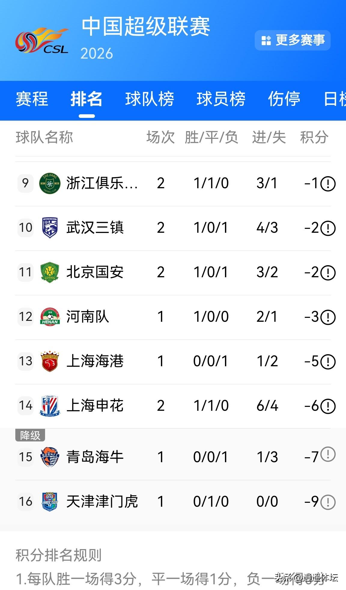 中超最新积分榜来了!前两场的比赛焦点莫过于罚款扣分的负分起步几名队伍!这几支队伍中表现最为出色的莫过于山东泰山!开局主场两连胜,分别战胜了辽小虎和国安,来到积分榜第四名!有可能从下一场开始,山东开始正式开启2026的中超之旅!北京国安一平一负抹掉了负3分,上海申花一胜一平抹掉负4分,上海海港想不到在主场输给河南,负的分没有变化。总之,今年中超最大的看点就是被处罚的队伍的负数什么时候能抹平,这是他们今年开局的第一目标,第二就是今年的中超冠军是否会从负分起步的队伍中产生来一个逆袭夺冠?