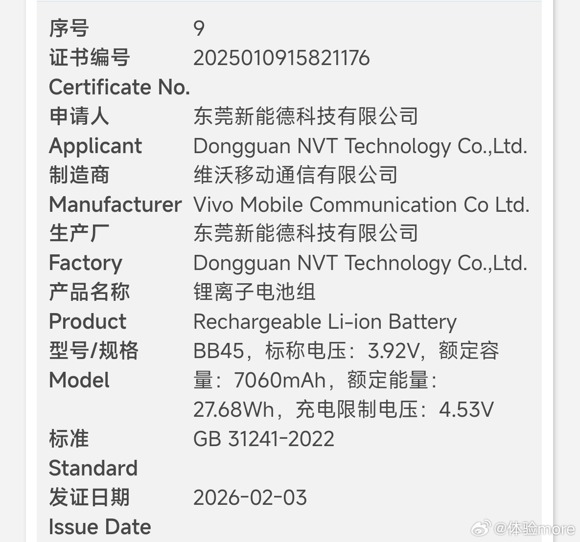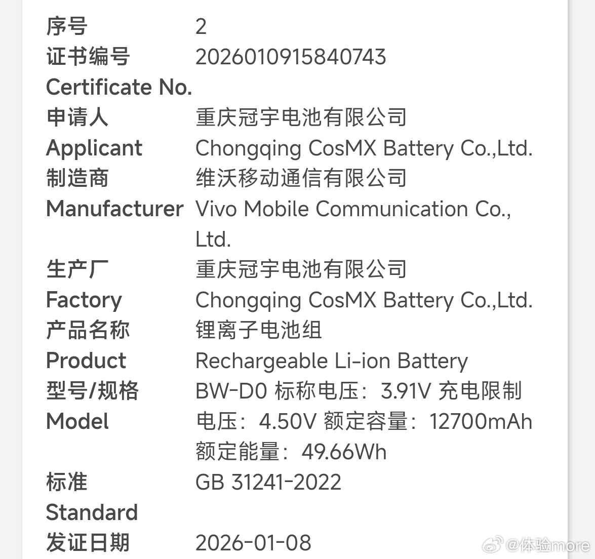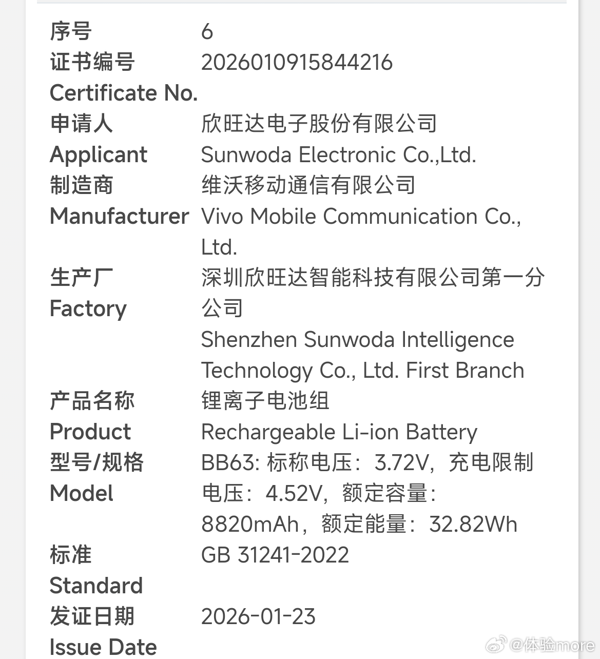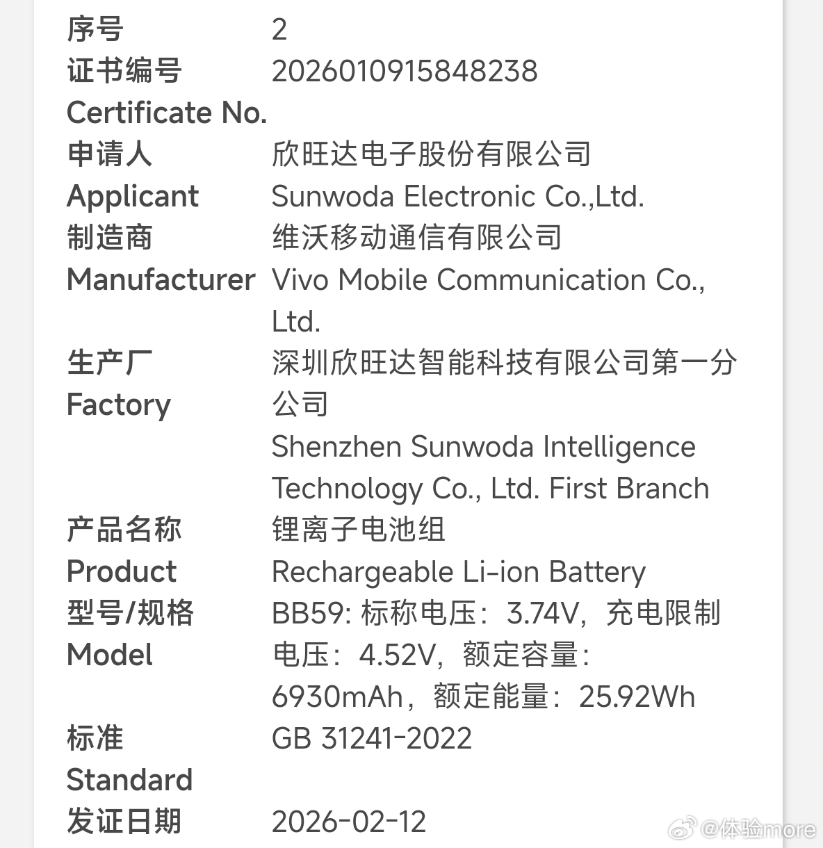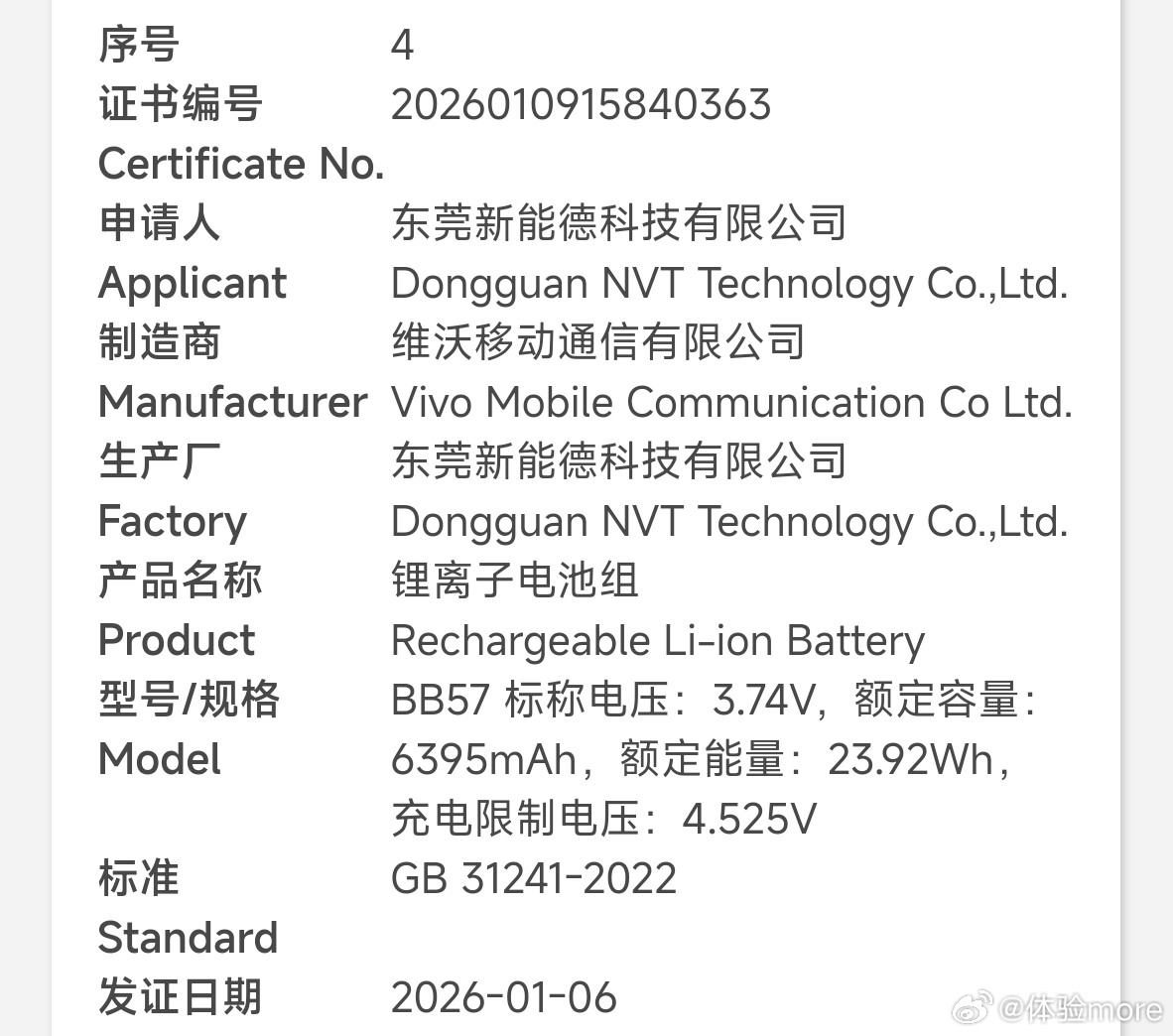 盘点一下vivo入网的一些电池:1、额定10000mAh,典型10200mAh±,预计Y系列搭载。2、额定8820mAh,典型9020mAh,iQOO Z11搭载。3、额定7060mAh,典型7200mAh,iQOO Z11x搭载。4、额定6930mAh,典型7100mAh,vivo X300s搭载。5、额定6395mAh,典型6530-6550mAh,vivo X300 Ultra搭载。6、额定12700mAh,典型13000mAh,vivo Pad6 Pro搭载。