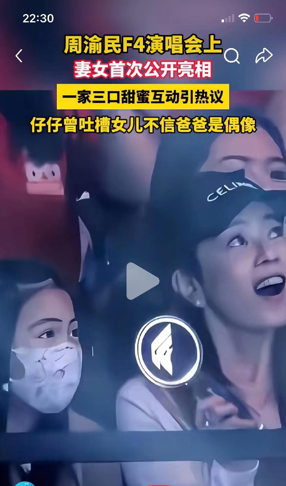我敢打包票 喻虹渊和女儿 应该是周渝民这辈子,最爱的那个人!看看F4演唱会的互动就知道! 他老婆的耳朵好有福气呀,耳朵大大的,大佛耳。老婆很漂亮,很阳光的脸。在《痞子英雄》里演的麦当劳收银员,笑起来就很阳光了,正好适合周渝民阴阴郁郁的脸,还是他喜欢的,一眼万年的那个女孩! 他女儿大双眼皮,大眼睛,能看出眉眼很像爸爸,是个小美女! 对此大家怎么看?