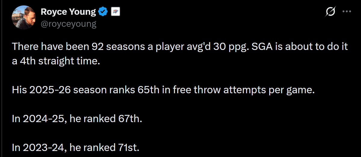 罗伊斯·杨反击“罚球商人”言论:NBA历史上共有92次球员单赛季场均得分30+,而亚历山大即将完成连续第四个赛季达成此成就。他本赛季的场均罚球出手数,在NBA历史30+得分赛季中仅排第65位。2024-25赛季排第67位。2023-24赛季排第71位。如果是自2000年开始算,NBA共有38次单赛季场均30+得分。而Shai过去三个赛季的罚球数在这38次中分别排名:第27、第28、第31。