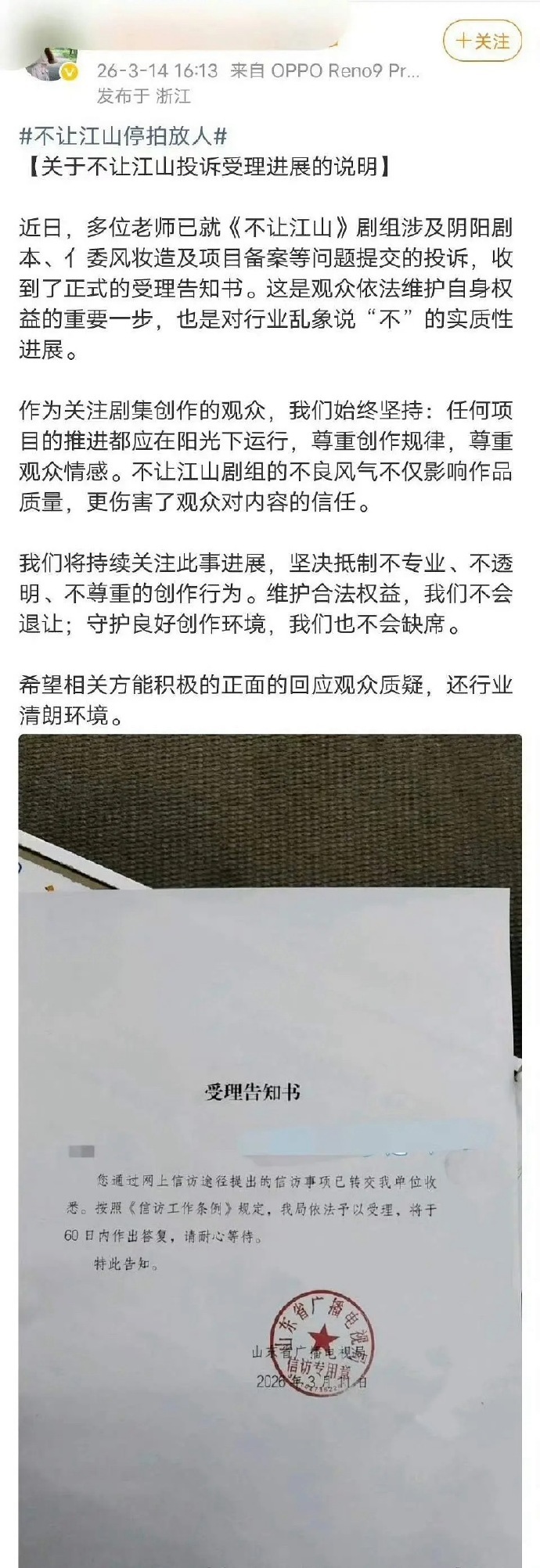 地方广电局回应了杨洋粉丝弄的《不让江山》的投诉受理告知书杨洋粉丝真的拎不清..杨洋好不容易有戏拍想让艺人掉饼吗?
