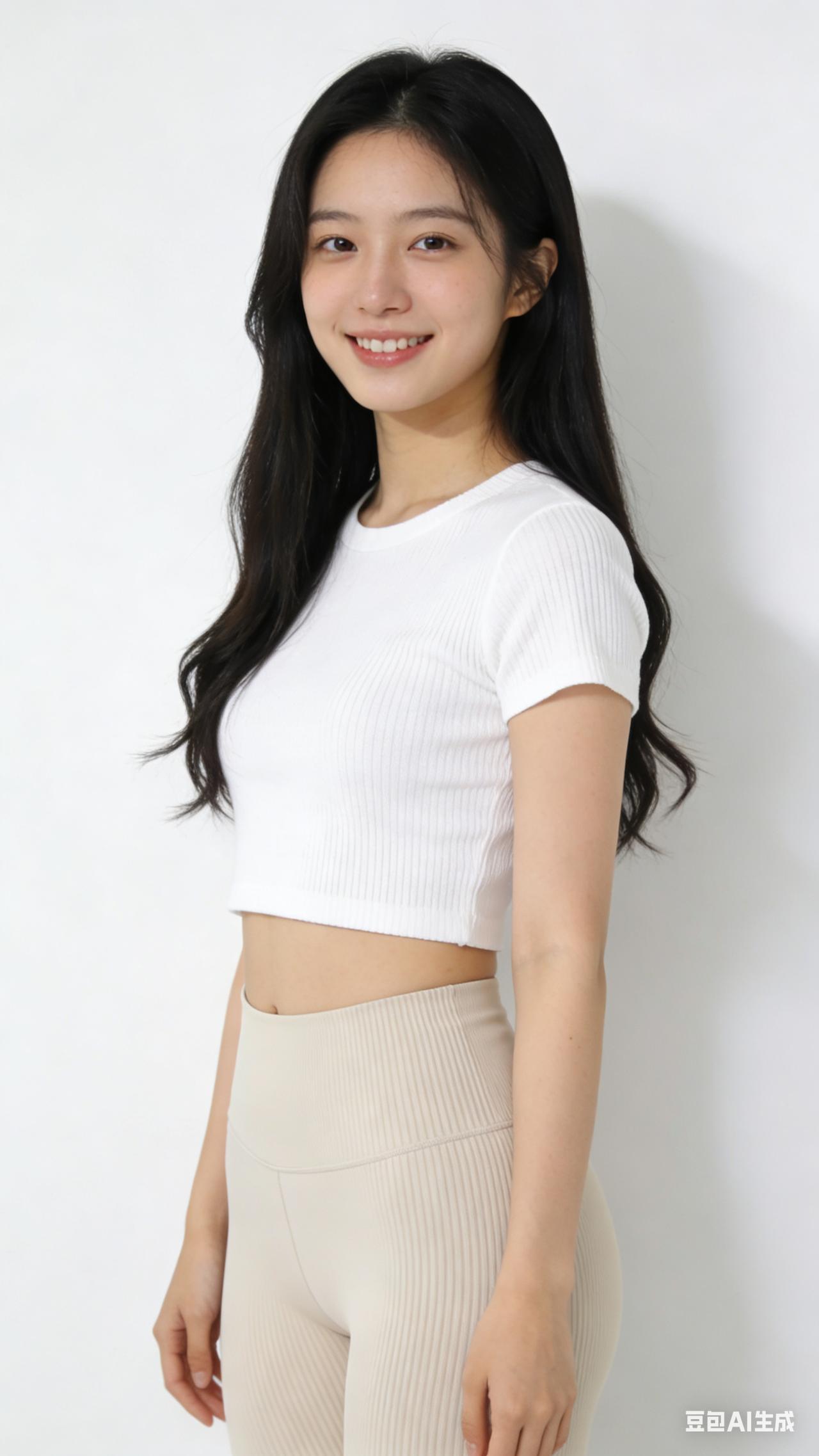 - 人物:20岁左右东亚女性,鹅蛋脸,皮肤白皙通透,眉眼舒展,嘴角上扬露出整齐牙齿,表情温柔亲和,黑色长直发微卷,发丝柔顺有光泽。 - 服饰:白色圆领短袖短款罗纹针织上衣,修身版型,长度刚好到腰线;浅米色高腰紧身瑜伽裤,竖坑条纹理,高腰设计贴合腰腹,展现流畅身材线条。 - 场景与光线:纯白极简背景墙,侧方柔和自然光,形成浅淡的墙面阴影,整体光线明亮均匀,无强烈对比,色调干净柔和。 - 构图与画质:9:16竖屏,中景构图(展示至大腿中部),人物居中,画面清晰细腻,质感通透,风格偏向日系清新、韩系温柔的生活写真。