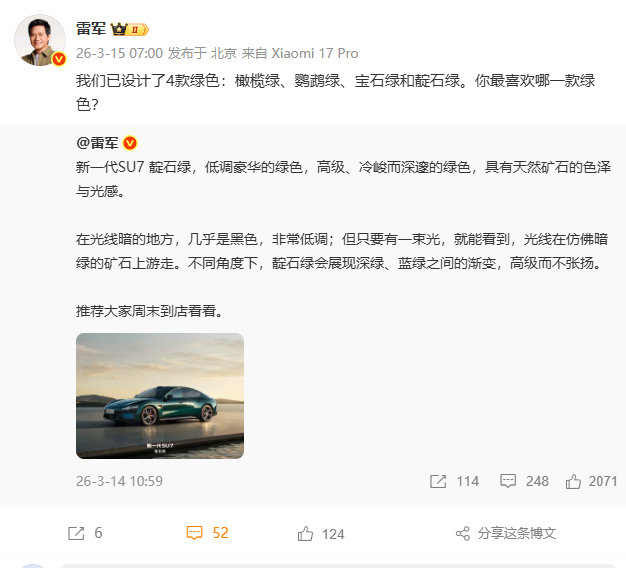【雷军:新一代SU7设计4款绿色】新一代SU7四款绿色3月15日,发文表示新一