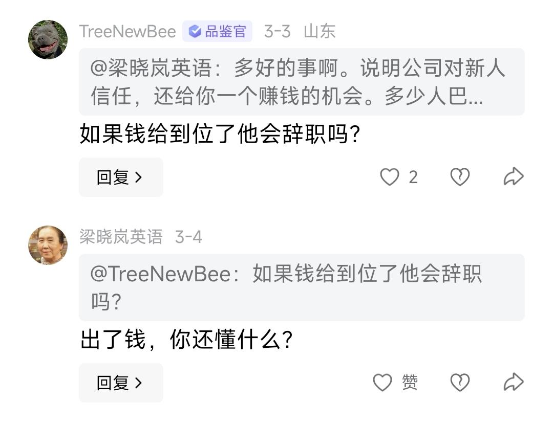这位梁什么英语的,内心是觉得员工上班不光不应该拿工资,还要倒给公司学费培养费。还要任劳任怨,接受公司的PUA。这是开教培机构的剥削么?