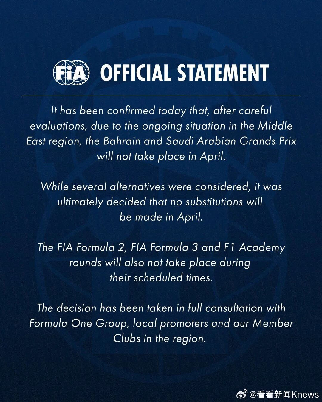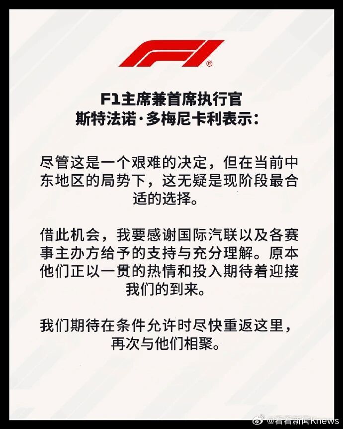 【#官方确认F1巴林沙特站不在四月举行#】3月15日上午,F1官方确认了本赛季巴林和沙特阿拉伯大奖赛将不会在四月进行。官方声明中表示,由于受中东地区当前局势影响,原定的F1连同F2、F3和F1学院赛事将不会如期举行。尽管考虑了其他备选方案,但四月将不会安排替代赛事。(五星体育)